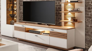 • Die Abbildung zeigt ein Wohnbeispiel, welches auch Dekoration sowie separat erhältliches Zubehör enthält. Im Lieferumfang enthalten ist ein Lowboard.