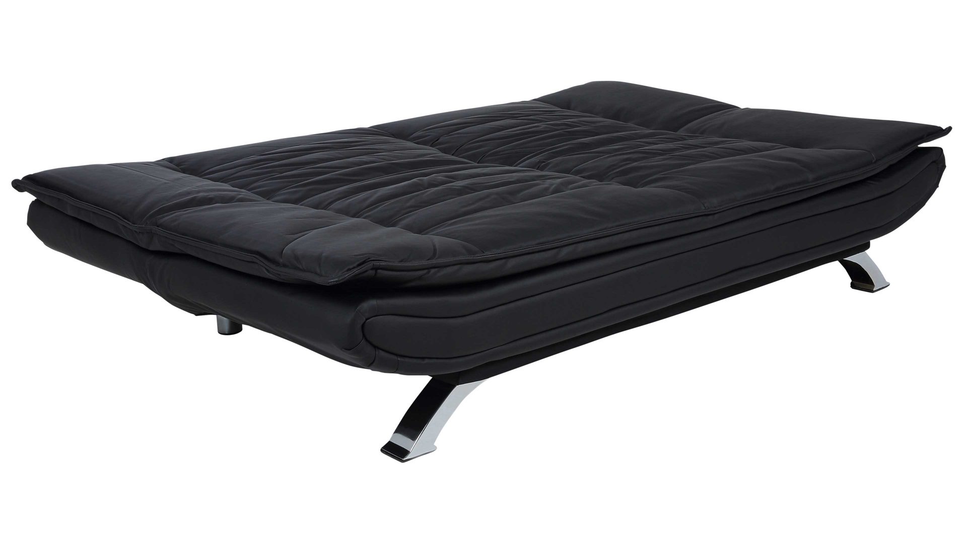 Das Schlafsofa Faith beeindruckt mit seinem modernen, eleganten Design sowie der Funktionalität, die es zu einem vielseitigen Polstermöbel macht. Für die nötige Standstabilität sorgen verchromte Metallfüße. Der schwarze Kunstlederbezug wirkt besonders edel und fühlt sich zudem sehr angenehm an. Einen gelungenen Akzent setzt die Quersteppung der Sitz- und Rückenfläche. Der Rücken der Couch ist mit schwarzem Nesselstoff bezogen.
