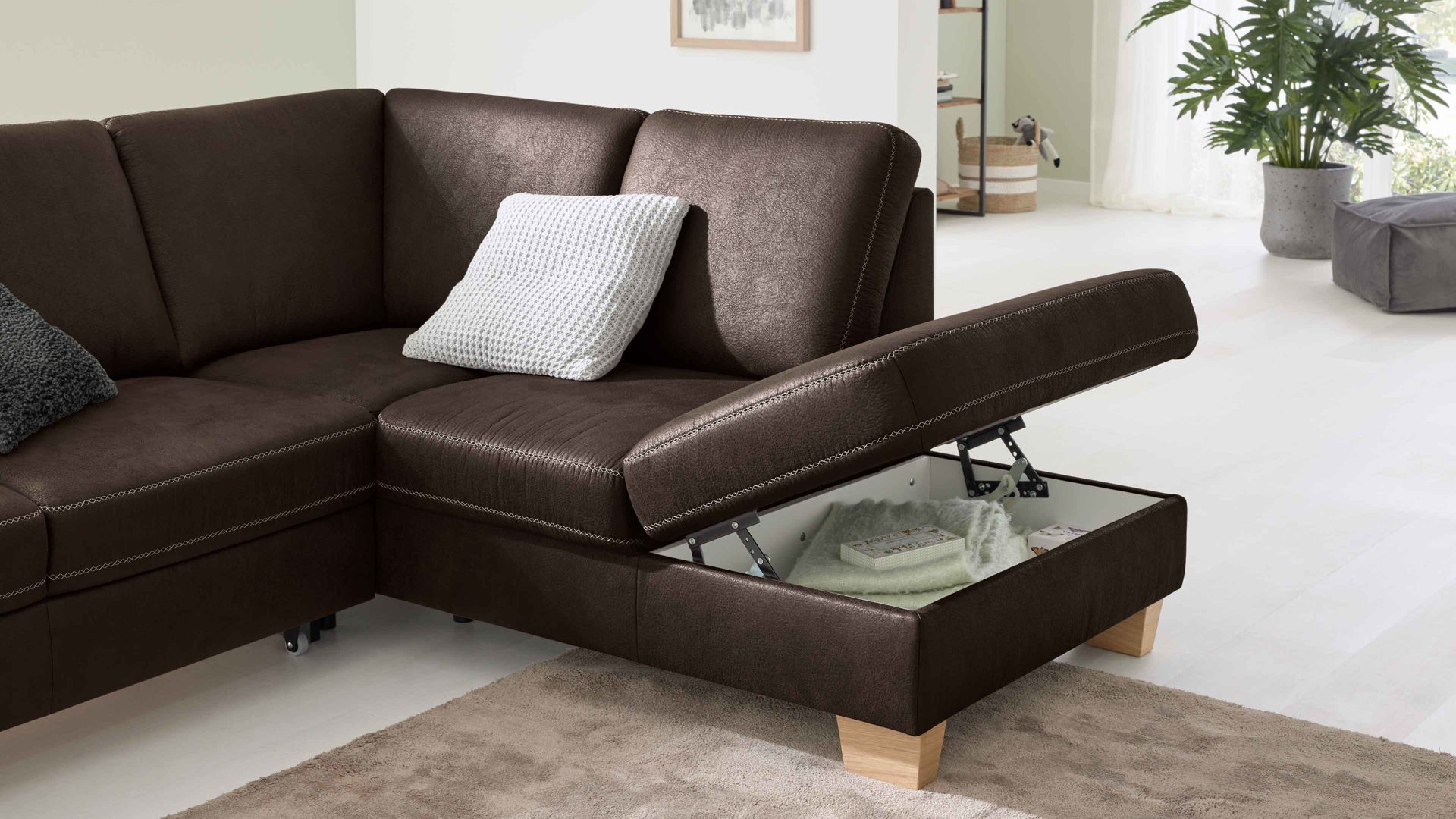 In der weiß beschichteten Schublade mit Stofffront verstauen Sie Kissen oder Gesellschaftsspiele. Ein weiteres Plus ist die Aufklappfunktion des Abschlusshockers - hier finden Decken oder andere große Dinge ihren festen Platz.