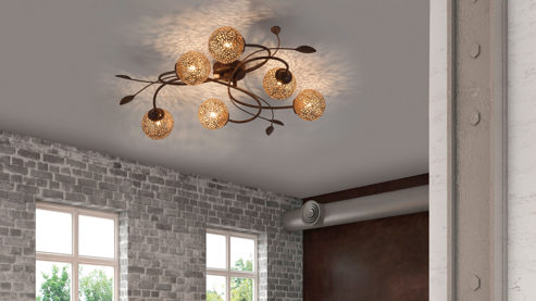 Die Paul Neuhaus LED-Deckenleuchte Greta leuchtet Ihren Wohnbereich wunderbar aus und fungiert zugleich als ansprechendes Dekoelement. Gefertigt aus rostfarbenem Metall in Kombination mit goldfarbenen Lampenschirmen beeindruckt die raffinierte Leuchte gleich auf den ersten Blick. Statten Sie die Deckenlampe einfach mit sechs G9-Leuchtmitteln mit je 40 Watt aus, die sich für die Energieeffizienzklasse A bis G eignen, und nehmen Sie das Lampenmodell direkt in Betrieb.