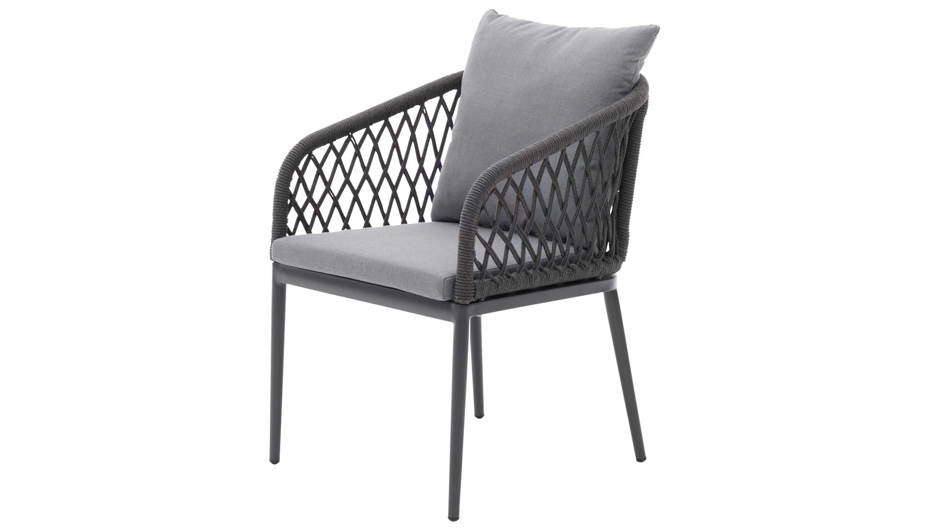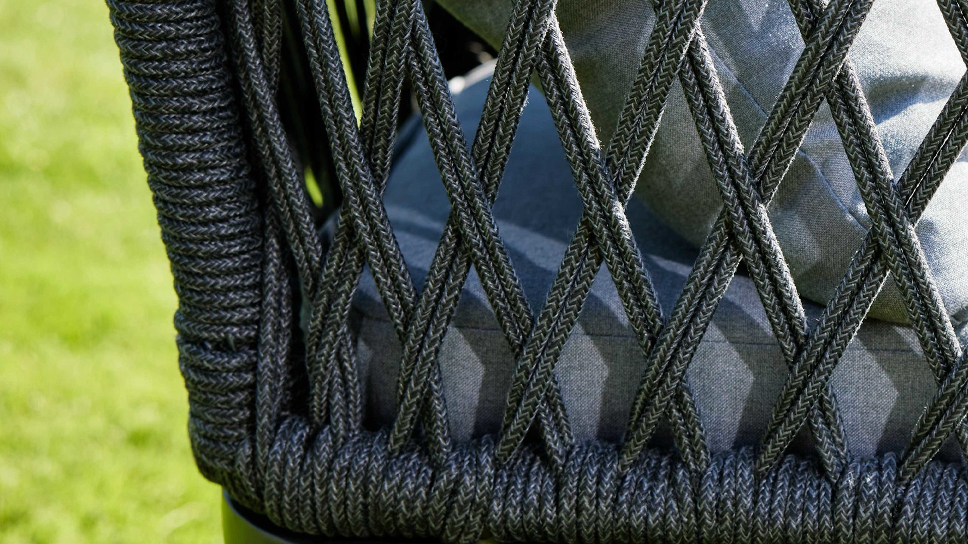 Der Sessel überzeugt durch sein graues Kordelgeflecht in dekorativer Rautenoptik, das gemeinsam mit dem anthrazitfarben pulverbeschichteten Aluminiumgestell einen modernen und luftigen Look erzeugt. Das verwendete Kordelmaterial besteht zu 100 % aus pflegeleichtem Polyester – witterungsbeständig, strapazierfähig und formstabil.