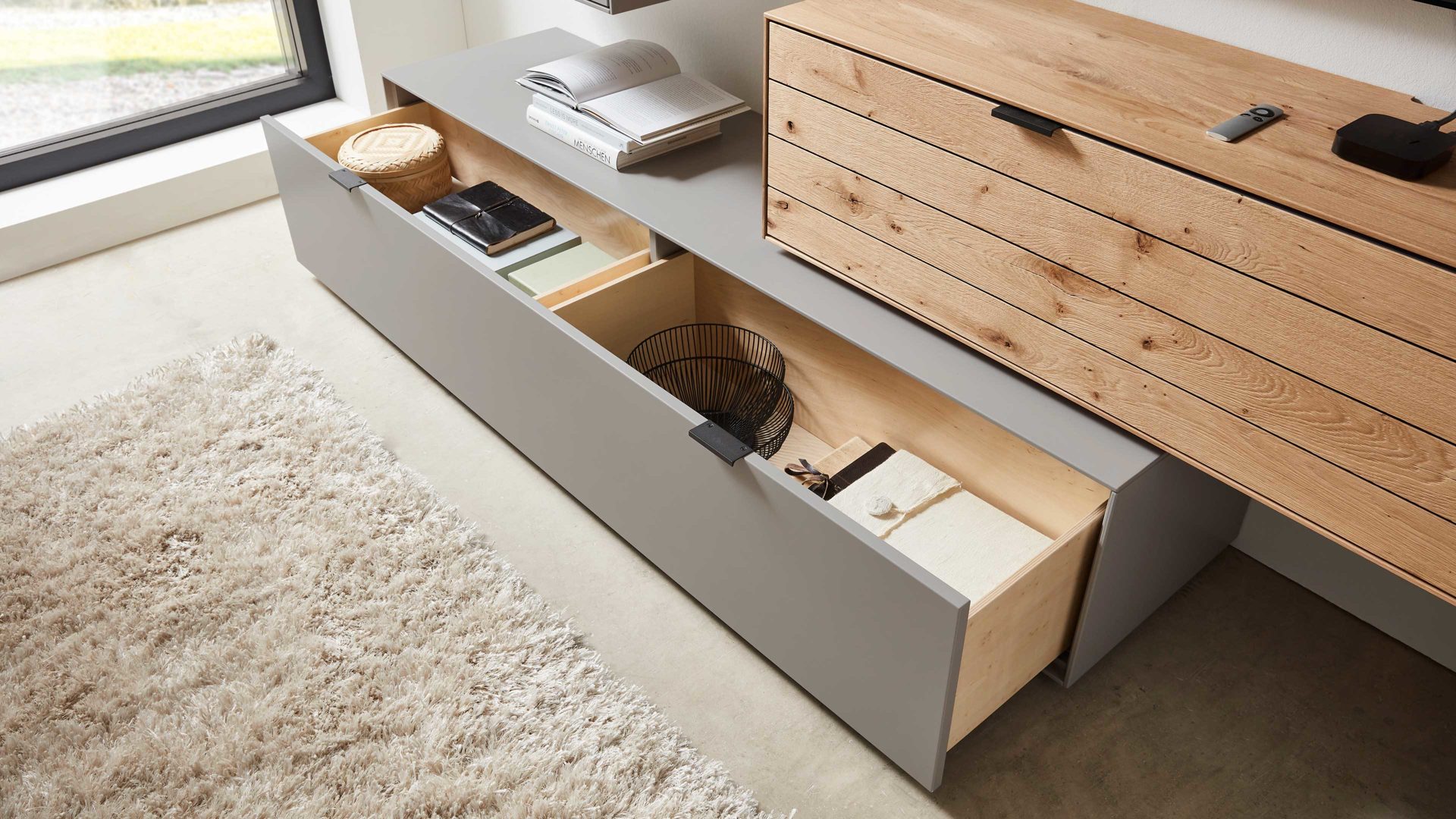 samtgraue Mattlackoberflächen, kombiniert mit stark gebürsteter Balkeneiche und soft gebürsteter Wildeiche