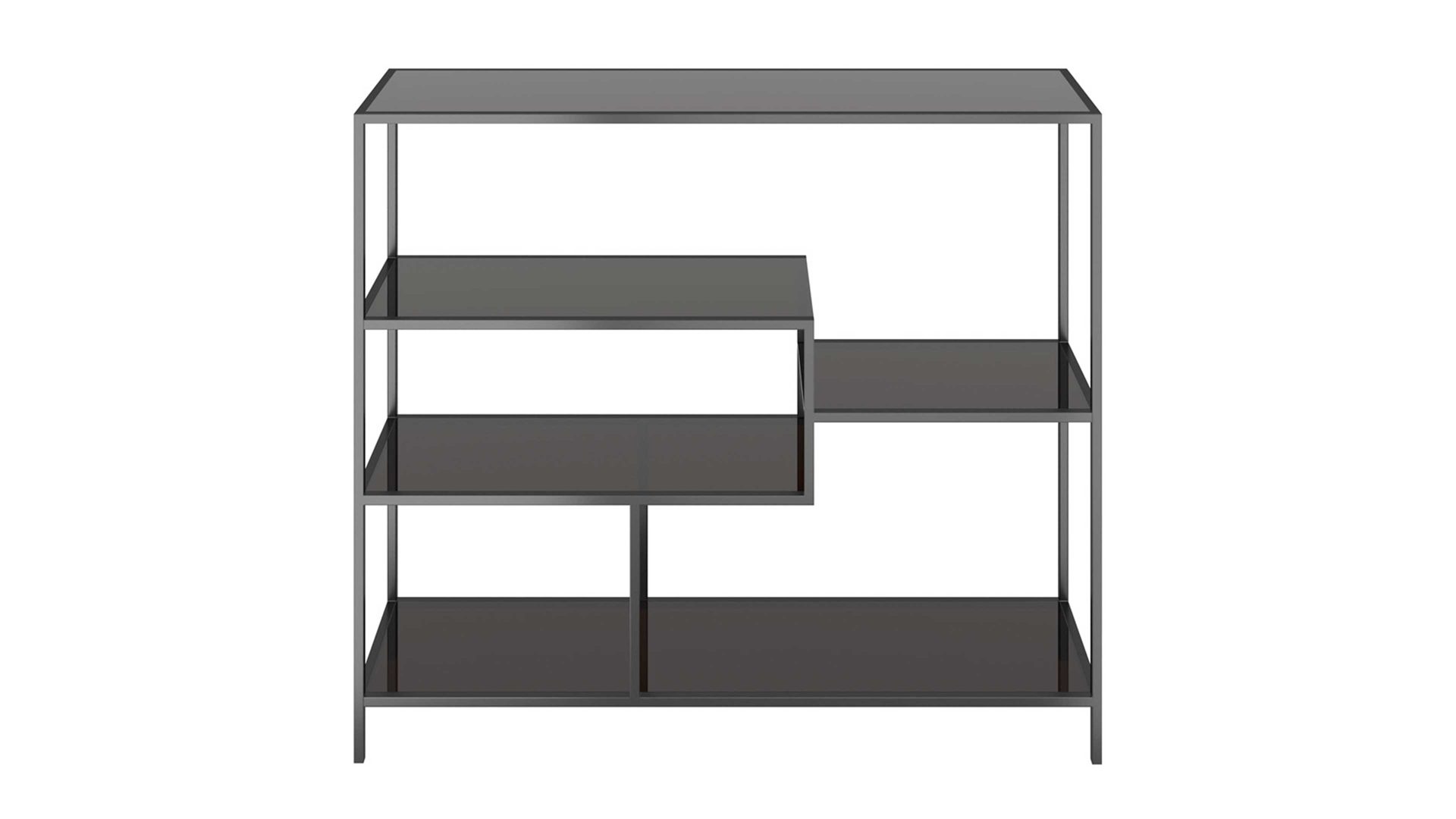 Während das Gestell aus anthrazitfarben pulverbeschichtetem Stahl besteht, sind die fünf Böden aus schwarz gefärbtem, 5 mm starken Sicherheitsglas gefertigt. Dank der hochwertigen Materialien ist das moderne Standregal enorm robust und stabil. Die Farben verleihen ihm eine betont elegante Ausstrahlung. Zudem begeistert die verspielte Formensprache mit der dennoch harmonischen Anordnung der einzelnen Abteilungen und Glasböden.