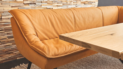 zweiteilige Eckbank mit lederbezogenen Rückseiten