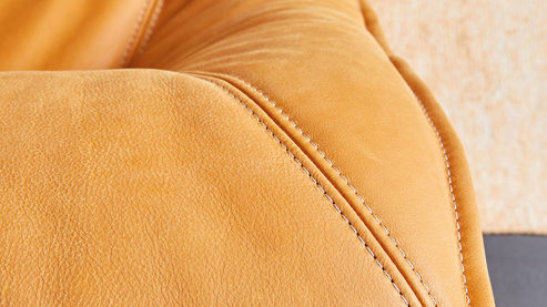 sonnengelber Lederbezug mit einer beigen Kontrastnaht und mattschwarzen Metallkufen