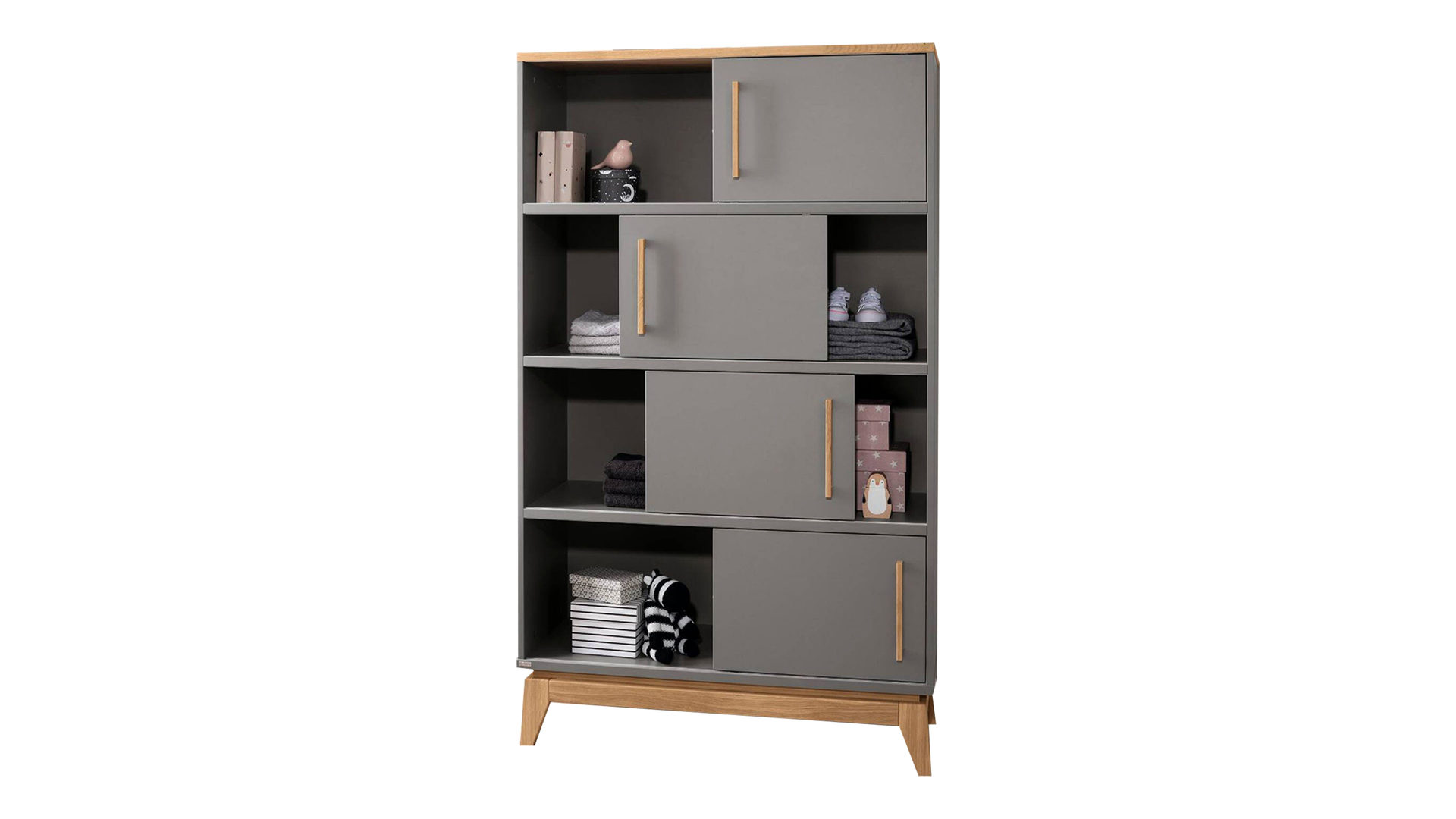 Funktional überzeugt der erstklassig verarbeitete Schrank mit vier Schiebetüren samt acht Fächern. Demnach steht reichlich offener und halbgeschlossener Stauraum für verschiedene Gegenstände zur Verfügung, etwa Spielsachen, Bücher und Zeitschriften, Fotoalben, CDs, DVDs und Blu-Rays oder andere Dinge, die entweder vor äußeren Einflüssen wie Licht und Staub geschützt oder dekorativ sichtbar aufbewahrt werden wollen. Die vier Türen lassen sich komplett von links nach rechts durchschieben. Auf ca. 95 x 161 x 40 cm (BxHxT) belaufen sich die Maße des praktischen Stauraumelements.