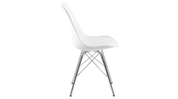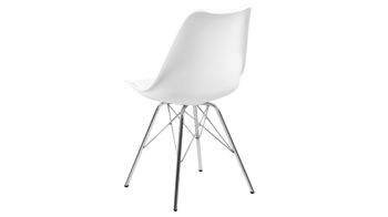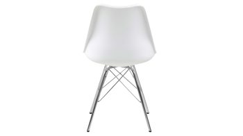 Dieser Polsterstuhl verkörpert puristische Eleganz. Als stabile, dabei aber wunderbar filigran designte Basis fungiert ein verchromtes Stahldrahtgestell. Darauf befindet sich eine weiße Sitzschale aus robustem Kunststoff. Sie ist rundherum mit weißem Kunstleder bezogen, das sowohl qualitativ als auch optisch und haptisch überzeugt. Die Farbgebung sorgt für eine klassisch-schlichte Ausstrahlung.