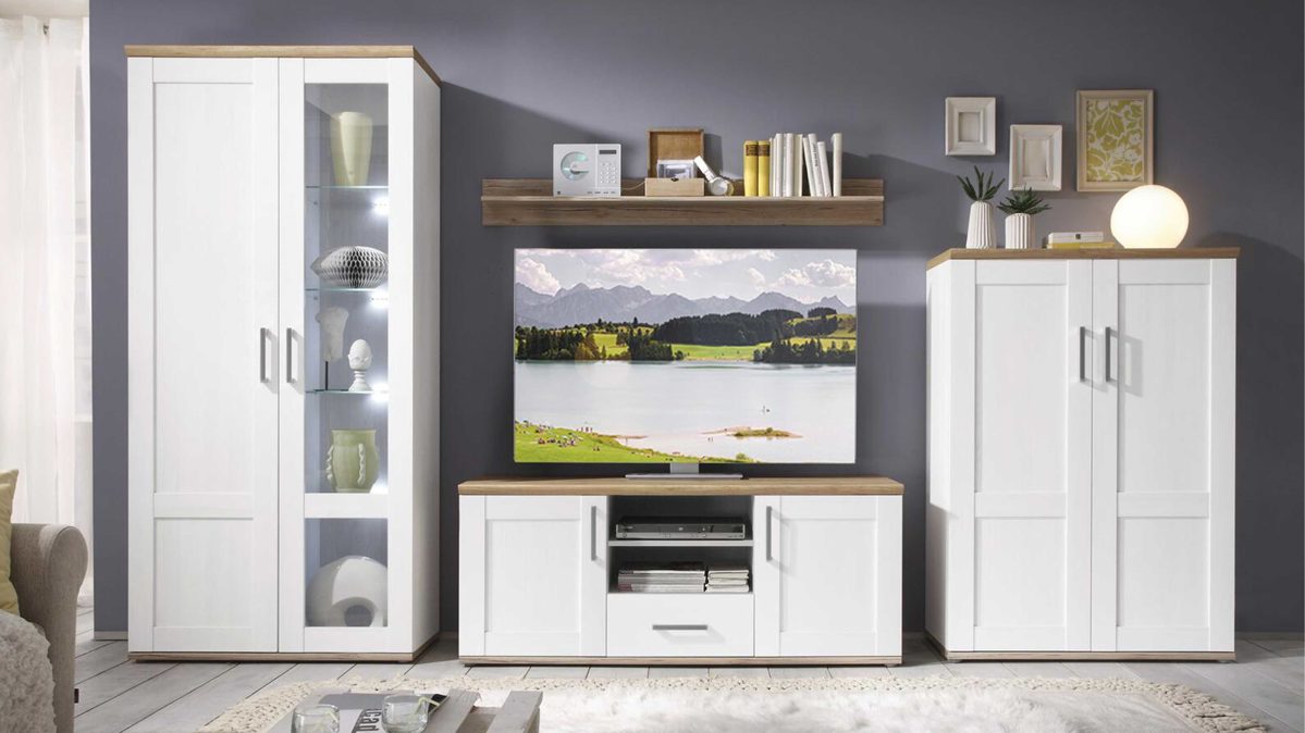 Ein Einrichtungstraum im skandinavischen Landhausstil ist diese vierteilige Wohnwand, die Maße von ca. 329 x 200 x 50 cm (BxHxT) aufweist. Gefertigt wurde sie aus Sibiu Lärche-Nachbildung in Kombination mit hellen San Remo Kunststoffoberflächen. Ein stattlicher Vitrinenschrank mit einer Holztür sowie einer Glastür, Maße ca. 93 x 202 x 46 cm (BxHxT), wird zum Blickfang der Wohnkombination. In seinem Inneren verbergen sich vier Glas- sowie vier Holzböden. Kaltweiße LED-Beleuchtung setzt die Glasböden der Vitrine geschmackvoll in Szene. Ein Wandboard mit Rückwand, Maße ca. 143 x 17 x 24 cm (BxHxT), kann als Abstellfläche für Bücher, DVDs oder Dekoaccessoires genutzt werden.