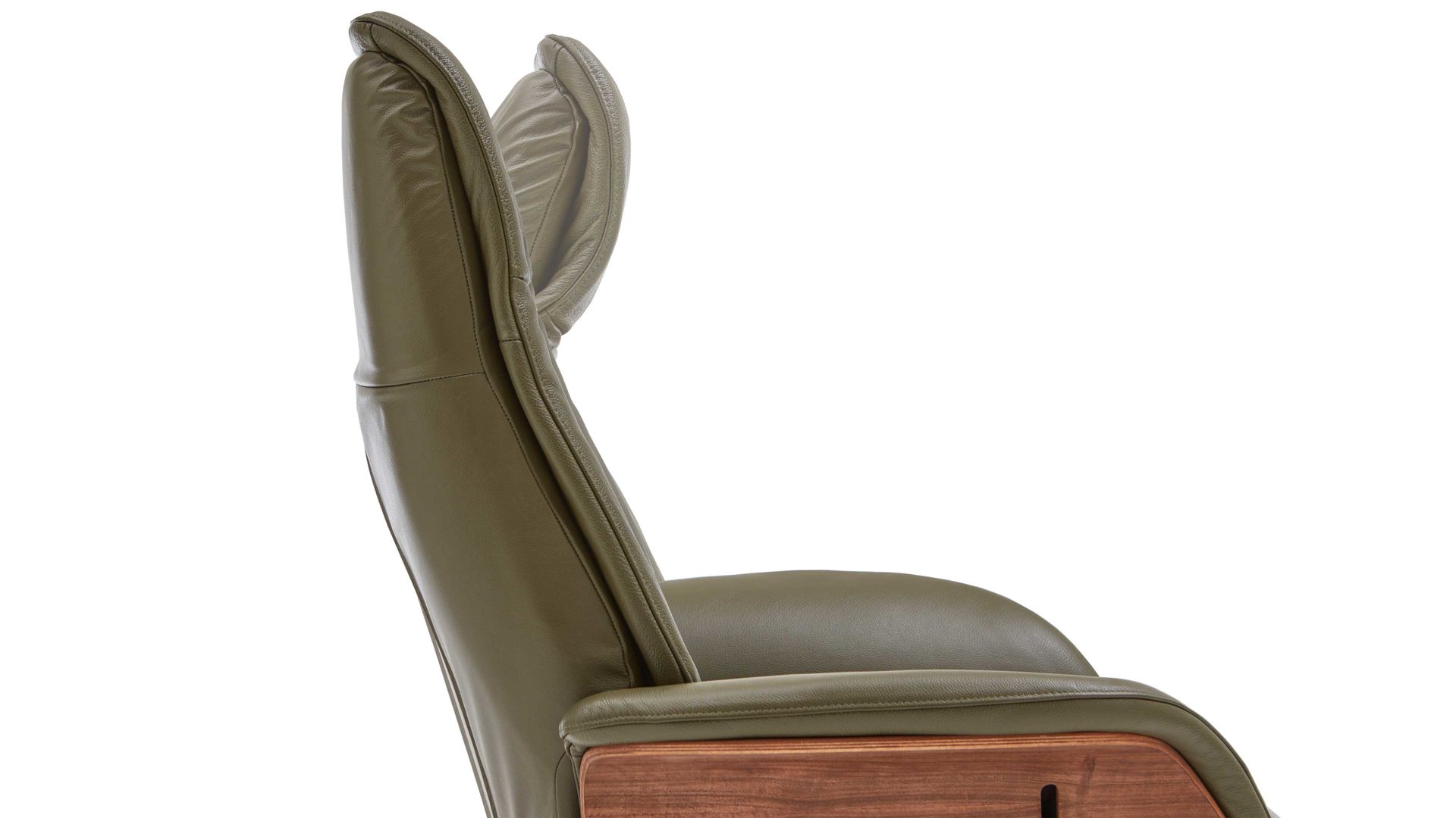 Sie sind auf der Suche nach einem schönen und sehr bequemen Sessel? Dann ist dieser Relaxsessel bzw. Drehsessel mit einem strapazierfähigen dunkelgrünem Lederbezug, der Sitzschale in geöltem Nussbaum und einem modernen Sternfuß aus schwarzem Metall genau das richtige Sitzmöbel für Sie. Nutzen Sie die manuell verstellbare Relaxfunktion und stellen Sie den Ledersessel so ein, dass Sie komfortabel lesen und fernsehen können.