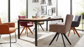 Sie können den Tisch in mehreren Details an Ihren Bedarf und Geschmack anpassen: Er ist in zwei Größen erhältlich. Die Tischplatte steht Ihnen außer in Massivholz auch noch in Glaskeramik zur Wahl. Darüber hinaus sind passend zum Tisch Stühle mit und ohne Funktion, in drei Gestellvarianten und in sechs Bezug-Kombinationen verfügbar.