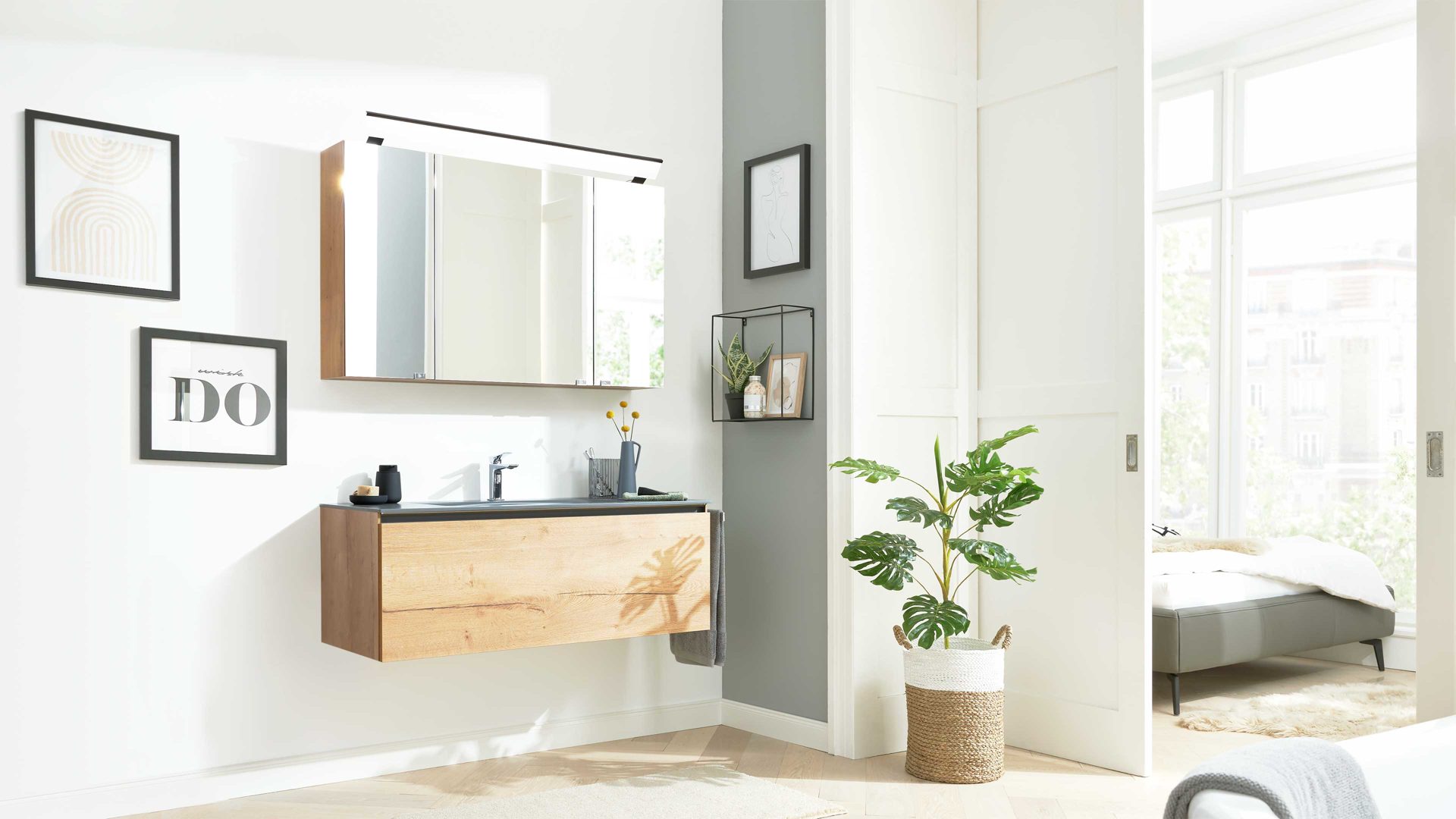 Die Bad-Kombination aus der Interliving Bad Serie 7405 präsentiert sich in Eiche-Sierra-Nachbildung und strahlt moderne Eleganz mit natürlichem Charme aus.