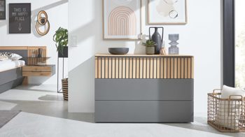 Die Schubladenkommode aus der C.DISSELKAMP Schlafzimmerserie Charleston bietet eine elegante und stilvolle Lösung für Ihr Schlafzimmer. Die Kommode zeichnet sich durch ihre grauen Lackoberflächen in Kombination mit einer massiven Wildeiche Abdeckplatte aus, die dem Möbelstück einen modernen und zeitlosen Look verleiht.