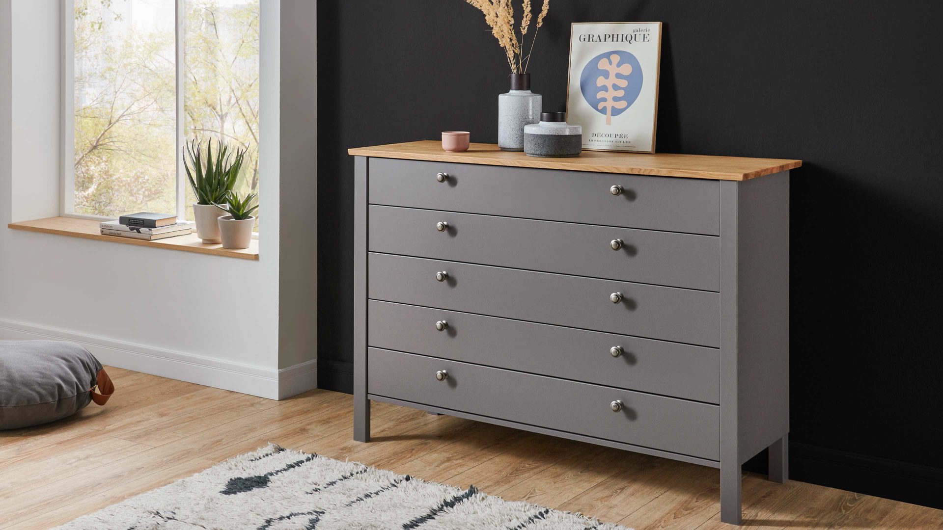Die Maße der Schubkastenkommode betragen ca. 134,1 x 94,5 x 47 cm, wobei die Schubladenbreite ca. 120 cm beträgt. Dieses Möbelstück passt perfekt zu den anderen Produkten aus der Charleston Serie.