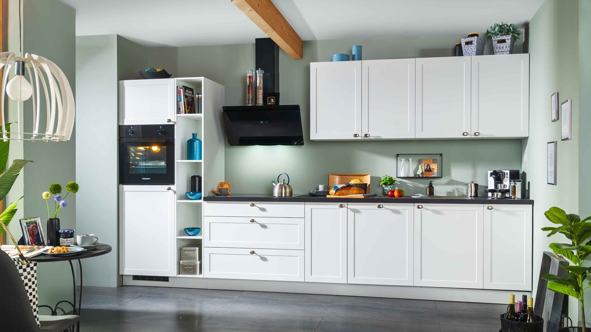 mattweiße Lacklaminatfronten, kombiniert mit schwarzer Steinstruktur-Nachbildung