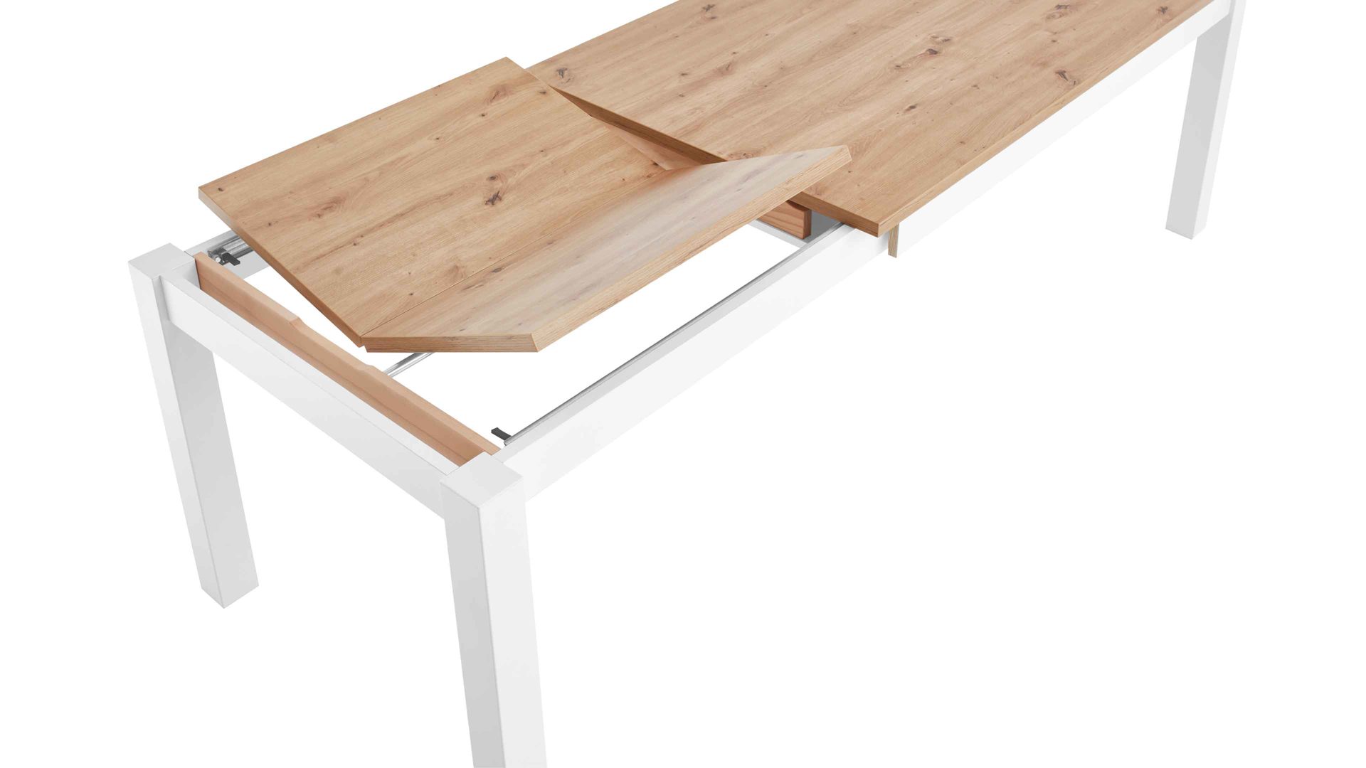 Er besteht aus hochwertigen Materialien, ist exzellent verarbeitet und präsentiert sich zudem modern und stilvoll designt. Durch die gelungene Kombination aus Eiche Artisan-Nachbildung mit klassischem Weiß strahlt der funktionsstarke Esszimmertisch natürlich warmen Charme und puristische Eleganz aus.