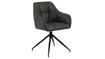 Er kombiniert ein mattschwarz lackiertes Stativgestell aus robustem Eisen mit einem cognacfarbenen Mikrofaserbezug in Lederoptik und fügt sich in verschiedene Wohnstile harmonisch ein. Zu den optischen Highlights des Esszimmerstuhls gehört neben der Formensprache und den perfekt aufeinander abgestimmten Farben der markante Quereinzug im Rücken. Praktisch begeistern die Drehbarkeit um 180 Grad mit Rückholfunktion sowie die bodenschonenden Gleiter am Gestell.