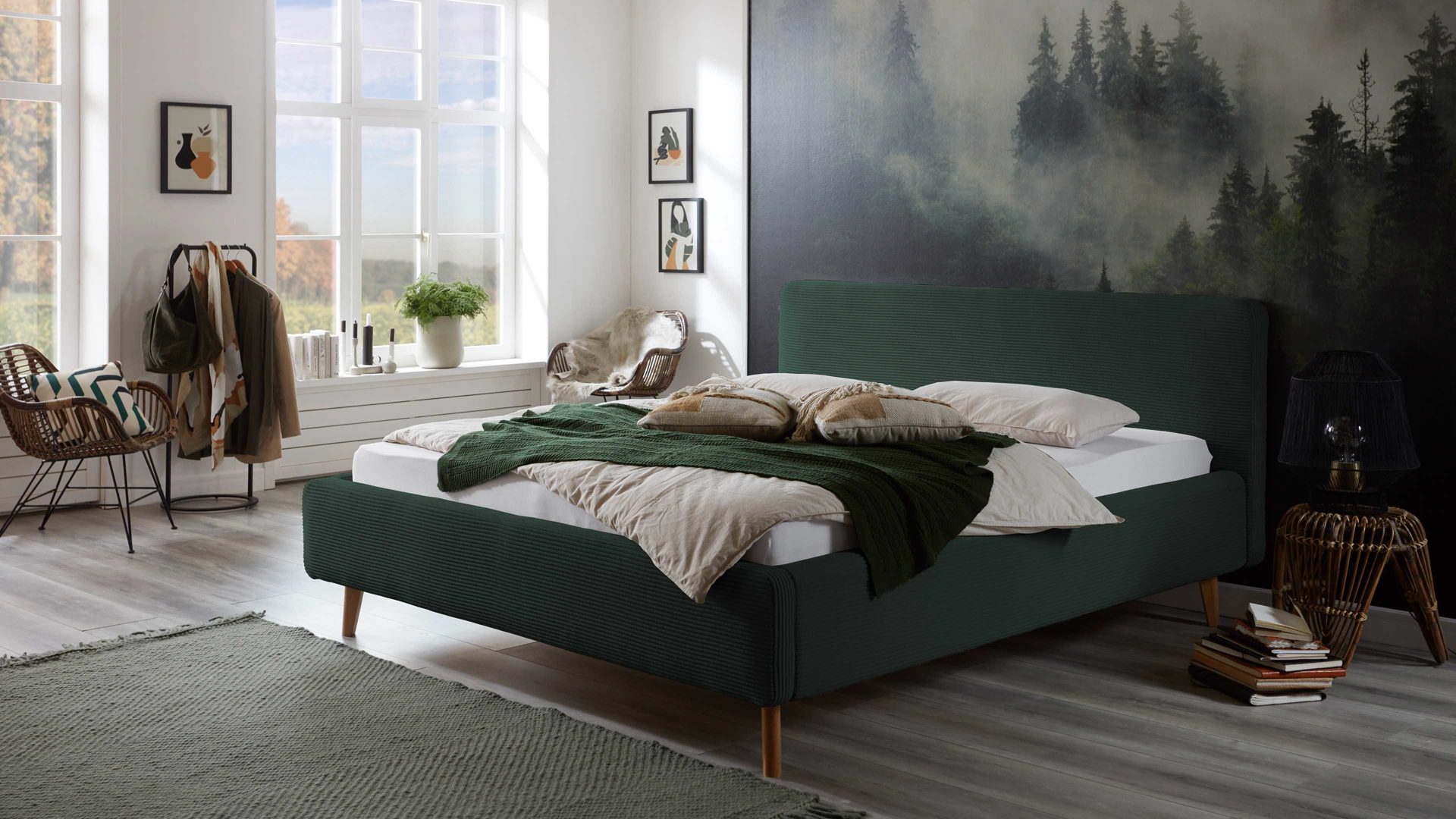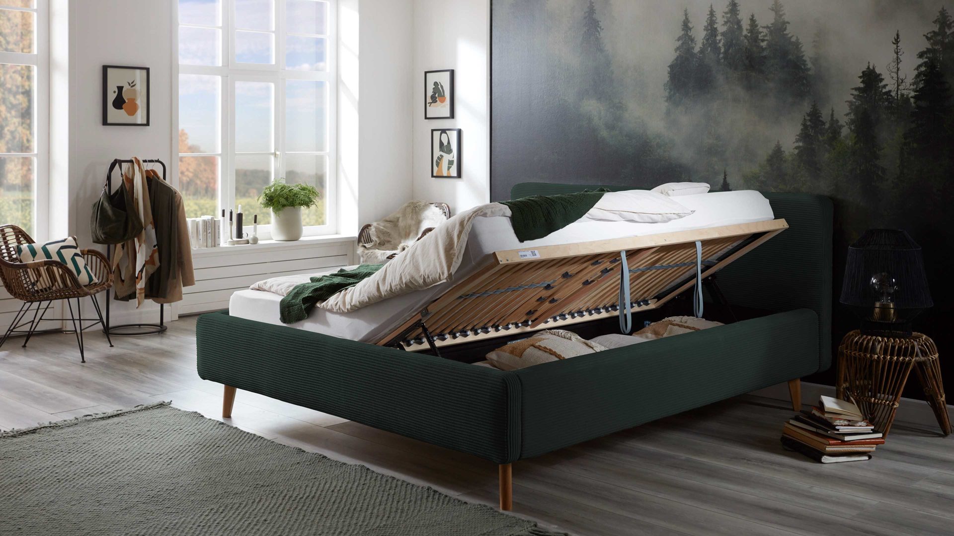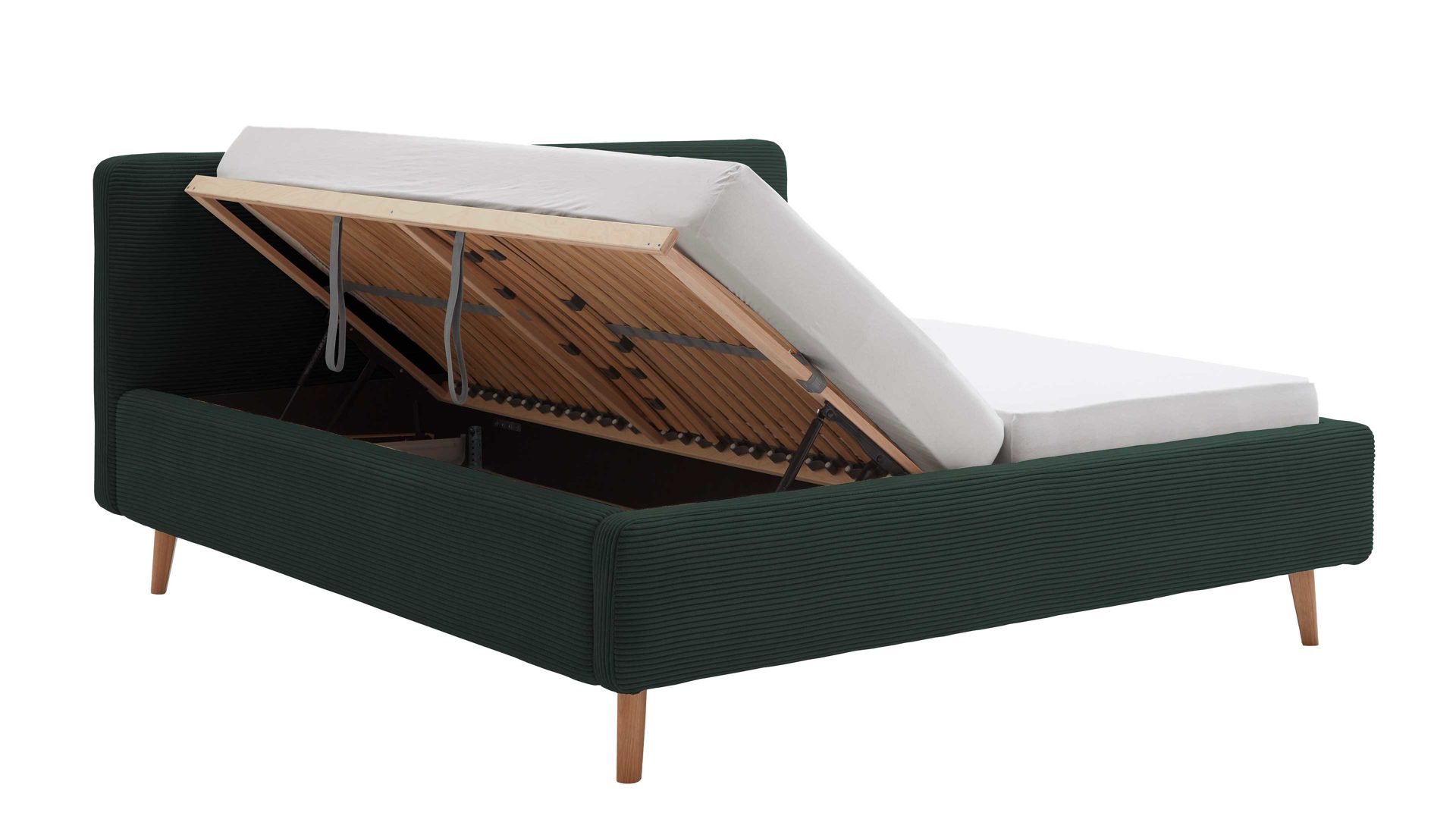 Das Polsterbettgestell Mattis mit Bettkasten begeistert durch die elegante Trendoptik sowie die exzellente Material- und Verarbeitungsqualität. Es kombiniert eichefarbene Holzfüße mit einem dunkelgrünen Breitcordbezug. Sowohl die Bettseiten als auch das Polsterkopfteil sind glatt bezogen. Letzteres lädt Sie ein, sich anzulehnen, wenn Sie abends im Bett vor dem Schlafen noch fernsehen oder in einem Buch lesen.