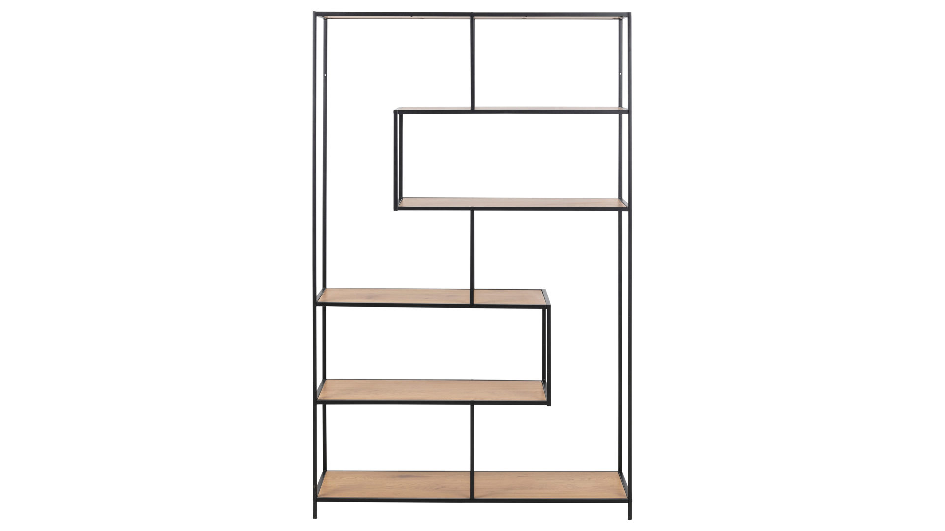 Die Böden in Wildeiche-Nachbildung machen das Regal zur ideale Ergänzung von rustikalen Holzmöbeln. Das schwarz pulverbeschichtete Stahlgestellt mit rauer Oberfläche gibt dem vielseitig einsetzbaren Büromöbel oder Wohnzimmermöbel die nötige Stabilität und Robustheit. Mit großzügigen Maßen von ca. 114 x 185 x 35 cm (BxHxT) passt das attraktive Bücherregal perfekt sowohl in große als auch kleine Wohnräume.