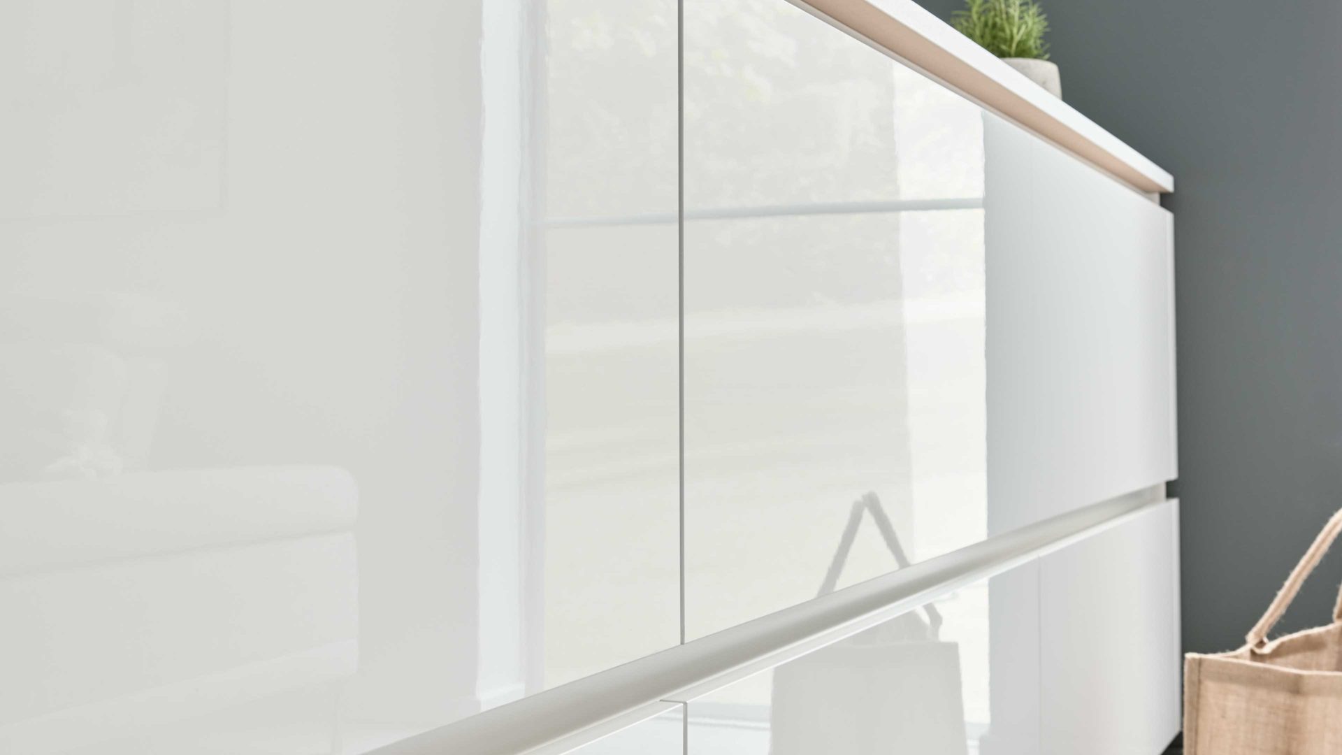 Die Interliving Küche Serie 3069 vereint moderne Eleganz mit cleverer Raumplanung. Die Kombination aus weißen Hochglanz-Lacklaminatfronten und markanter Stripe-Wood-Coffee-Nachbildung sorgt für eine ausdrucksstarke Optik. Grifflos gestaltete Fronten und premiumweiße Arbeitsplatten runden das klare, geradlinige Erscheinungsbild perfekt ab – für ein stilvolles Küchenerlebnis mit Charakter.