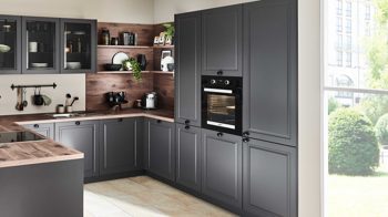 Die nolte® Einbauküche Porto verbindet klassischen Landhauscharakter mit einer modernen, klaren Designsprache. Graphitfarbene 3D-Lacklaminatfronten sorgen für eine stilvolle Tiefenwirkung, während Korpusse und Sockelblenden im gleichen Farbton ein harmonisches Gesamtbild schaffen. Die Arbeitsplatten in Eiche Castell-Nachbildung bringen Wärme ins Design und bilden einen natürlichen Kontrast zu den dunklen Fronten. Mattschwarze Knopfgriffe setzen dabei authentische Akzente im Landhausstil.