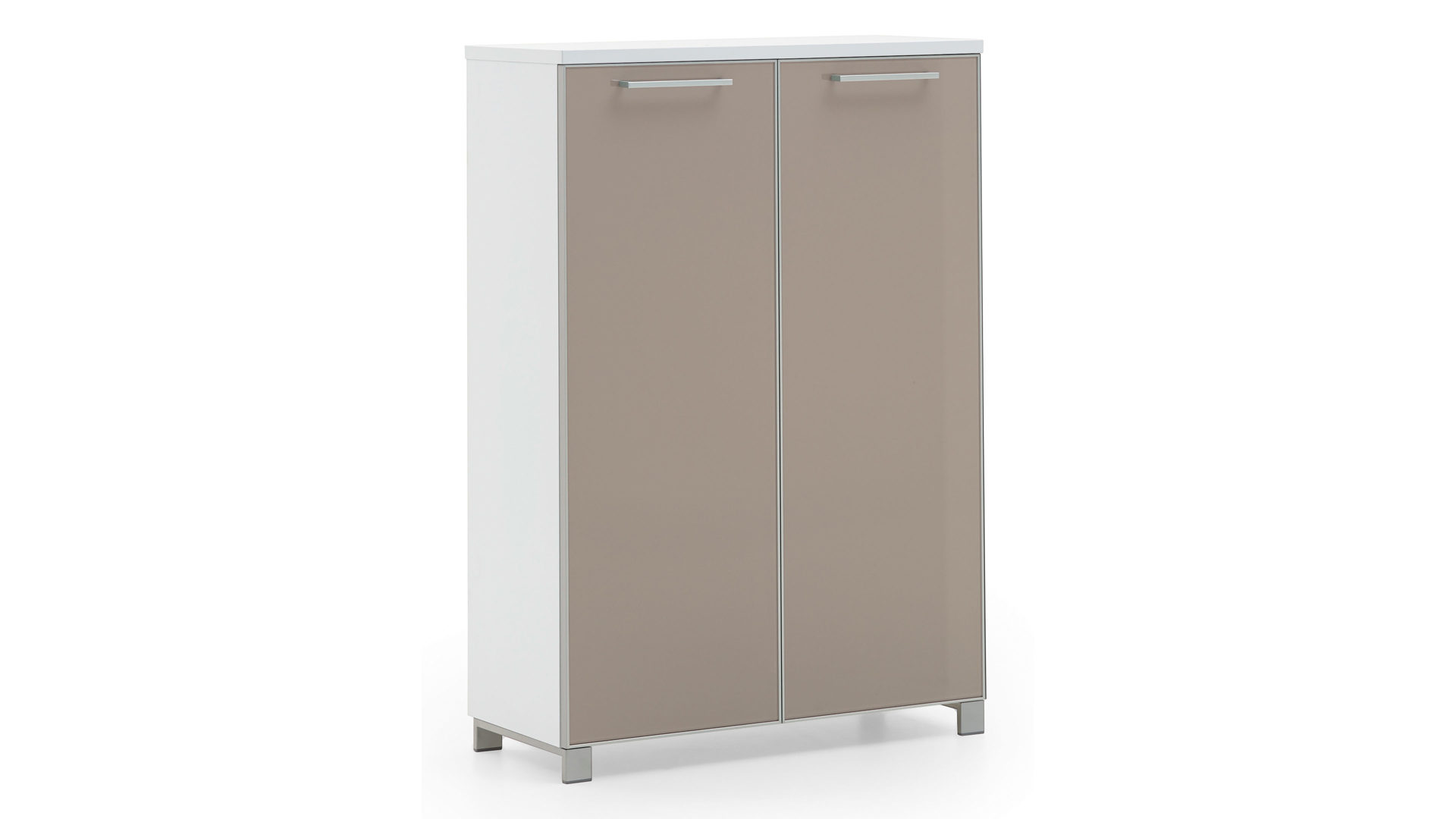 Durch die gelungene Kombination aus taupefarbenem Glas für die Front, Eiche Bianco Furnier für den Korpus und edelstahlfarbenem Metall für die Griffe strahlt der erstklassig verarbeitete Schuhkipper moderne Eleganz gepaart mit natürlichem, warmem Charme aus. Die zwei Türen mit einem festen Konstruktionsboden und vier verstellbaren Holzböden im Inneren bieten Ihnen Stauraum für ca. 24 Paar Schuhe. Die Maße des praktischen Schuhschranks belaufen sich auf ca. 84 x 126 x 37 cm (BxHxT).