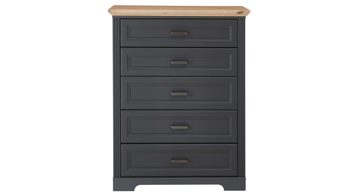 Die attraktive Schubladenkommode ist Teil einer umfangreichen Kommodenserie, die verschiedene Türen-, Schubladen und Kombikommoden in diesem stilvollen Landhaus-Look umfasst. Statt in tiefgründigem Graphit sind die Schränke auch in heller Pinie erhältlich. Alle Kommoden des ansprechenden Programms lassen sich einfach montieren.