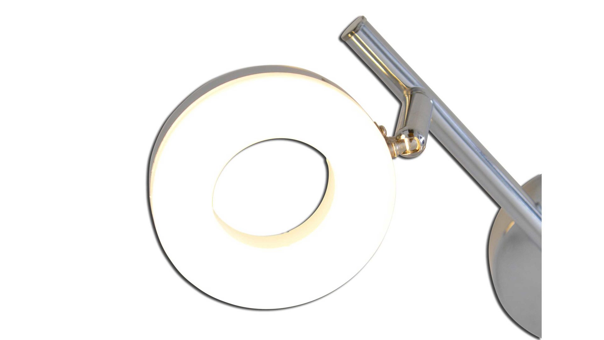 Hergestellt ist die qualitativ auf ganzer Linie überzeugende Wandleuchte aus Chrom und weißem Acrylglas. Die Materialkombination gewährleistet eine ausgeprägte Robustheit sowie Widerstandsfähigkeit. Bei adäquater Behandlung ist die Leuchte sehr langlebig. Die Höhe der Wandlampe beläuft sich auf ca. 19 cm, die Länge auf ca. 30 cm und der Durchmesser der attraktiven Leuchtringe auf jeweils ca. 9 cm. Alles in allem erscheint die Lampe elegant und kreativ.