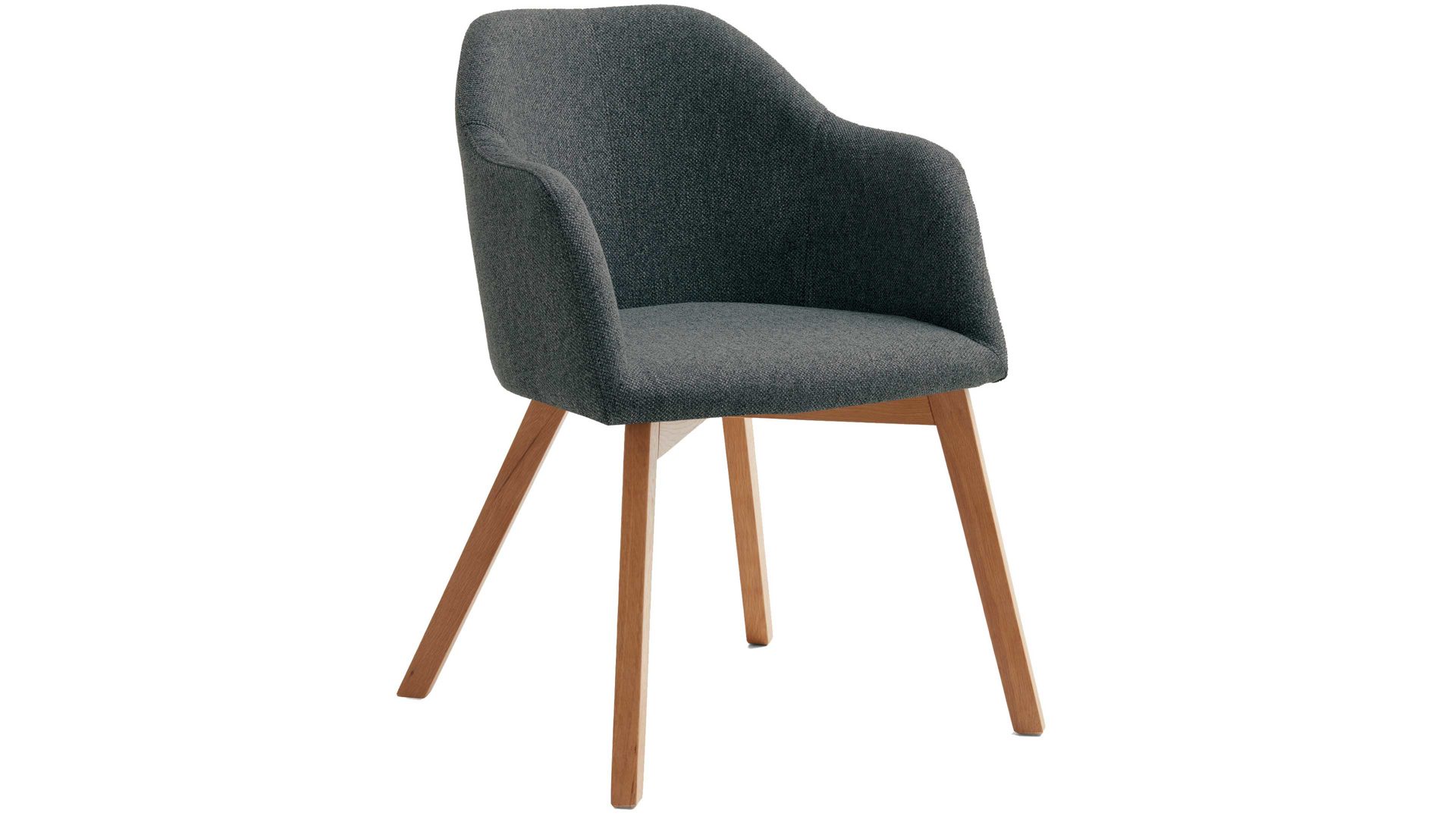 Der Armlehnstuhl Charly präsentiert sich modern und stilvoll designt. Darüber hinaus weiß er in puncto Komfort zu überzeugen. Lackierte Eichenholzfüße bilden die robuste Basis. Das natürliche Material sorgt einerseits für die nötige Stabilität und bringt andererseits ein warmes, einladendes Flair in den Raum. Attraktiv abgerundet wird der Vierfußstuhl durch den grauen Webstoffbezug. Die schlichte Farbe wirkt überaus elegant und harmoniert vorzüglich mit den Holzfüßen. Einen feinen Akzent setzt die Steppnaht im Rücken des Schalensitzes.
