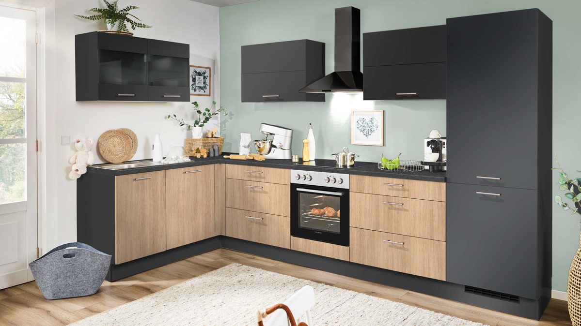 Eiche Aviva-Nachbildung und supermattes Grafit, kombiniert mit edelstahlfarbenen Metallgriffen und Arbeitsplatte Eichen Aviva-Nachbildung