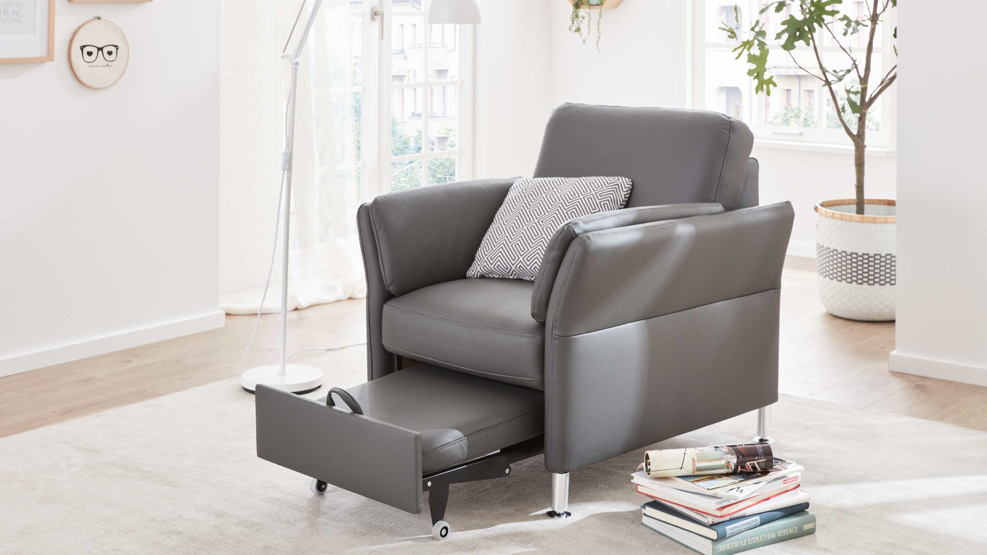 Dank der hochwertigen, soften Kaltschaumpolsterung auf Wellenunterfederung und der angenehmen Haptik des Leders genießen Sie auf dem edlen Polsterssel hohen Sitzkomfort. Seine Maße belaufen sich auf ca. 86 x 90 x 93 cm (BxHxT), bei einer Sitzhöhe von ca. 43 cm und einer bequemen Sitztiefe von ca. 56 cm. Das unschlagbare Plus dieses Ledersessels ist der Auszughocker mit Maßen von ca. 50 x 65 cm (BxL), der für noch mehr Bequemlichkeit sorgt.