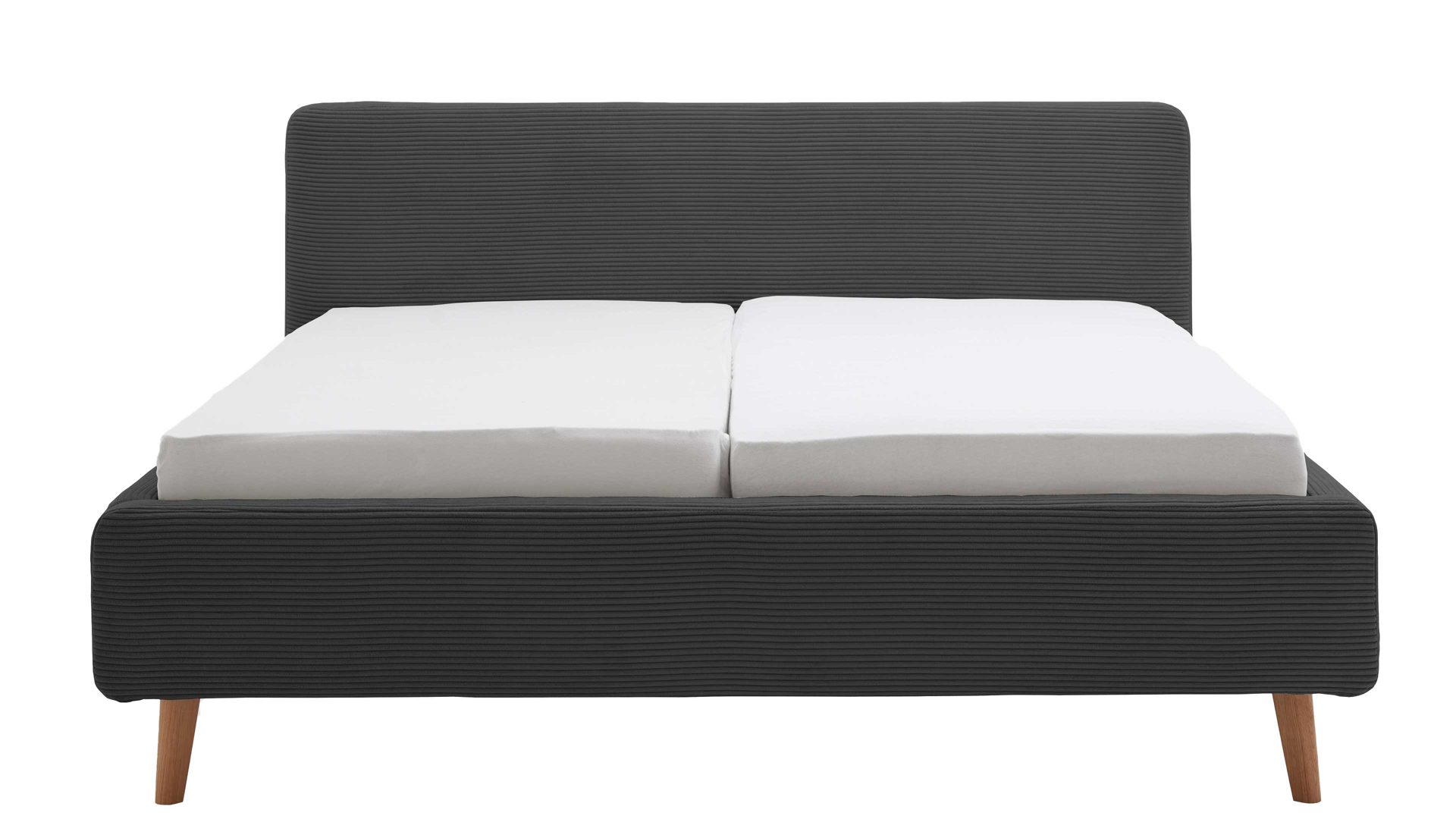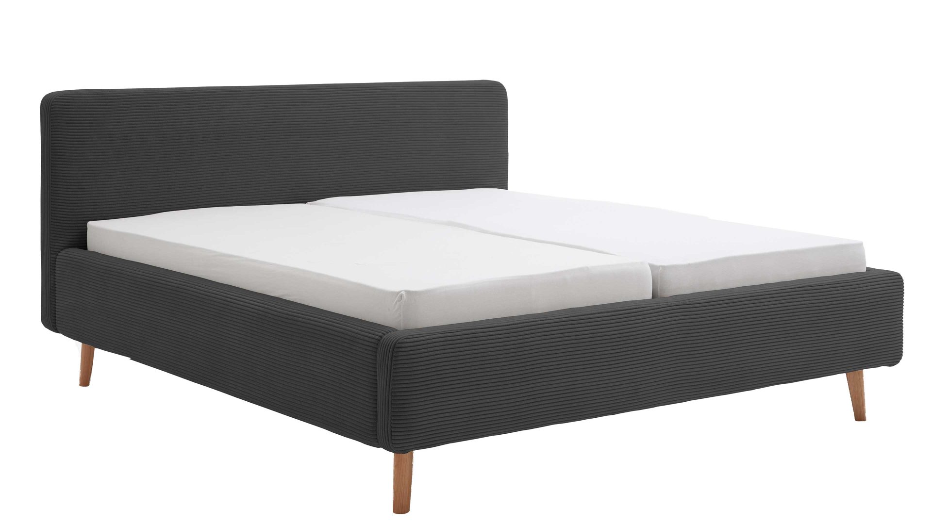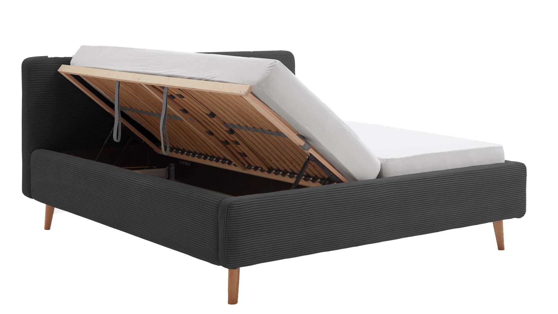 Das Polsterbettgestell Mattis mit Bettkasten begeistert durch die elegante Trendoptik sowie die exzellente Material- und Verarbeitungsqualität. Es kombiniert eichefarbene Holzfüße mit einem anthrazitfarbenen Breitcordbezug. Sowohl die Bettseiten als auch das Polsterkopfteil sind glatt bezogen. Letzteres lädt Sie ein, sich anzulehnen, wenn Sie abends im Bett vor dem Schlafen noch fernsehen oder in einem Buch lesen.