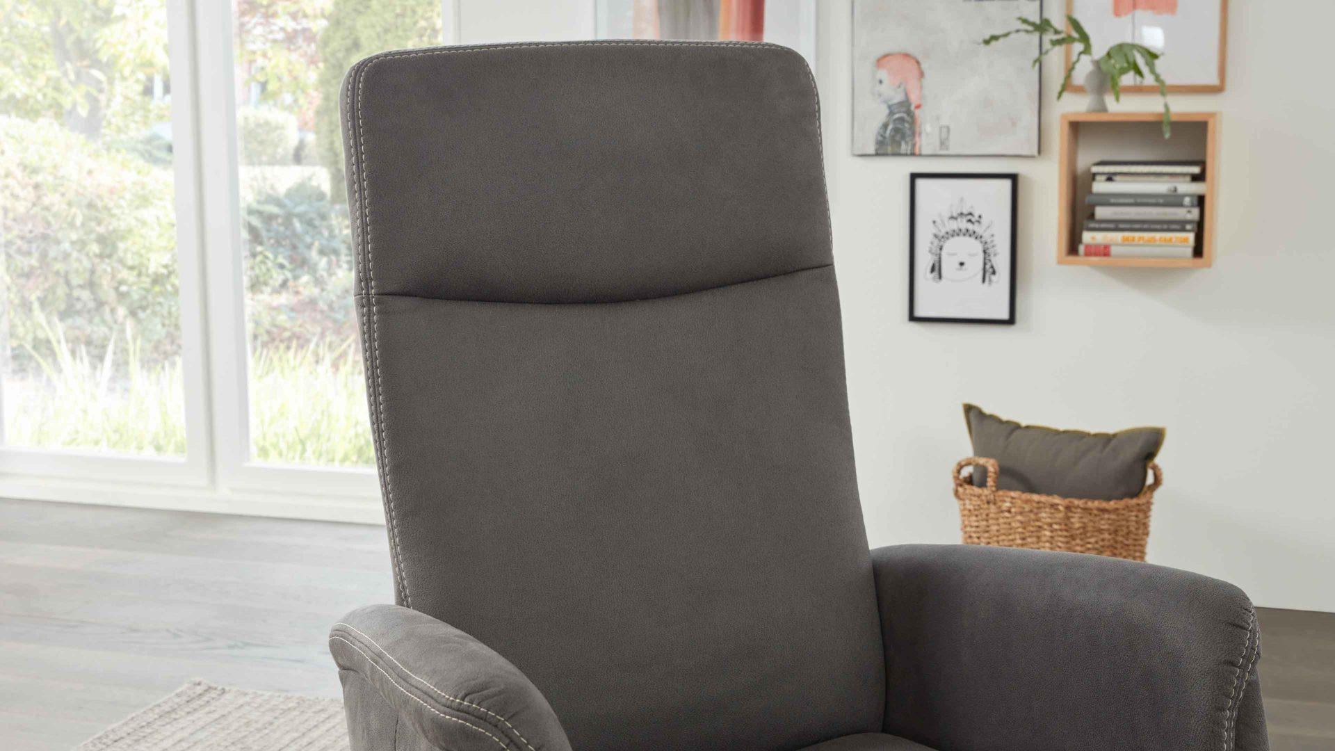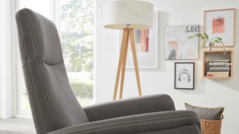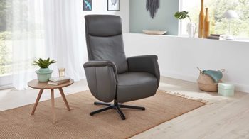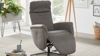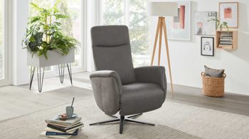 Das Highlight des Sessels bildet die manuelle Relaxfunktion: Leichter Körperdruck führt dazu, dass sich der Rücken senkt. Dabei geht der Sitz automatisch nach vorn und oben. Parallel fährt die Beinauflage nach oben bis in die Relaxposition. Zudem begeistern das stufenlos verstellbare Kopfteil und die Drehbarkeit um 360 Grad.