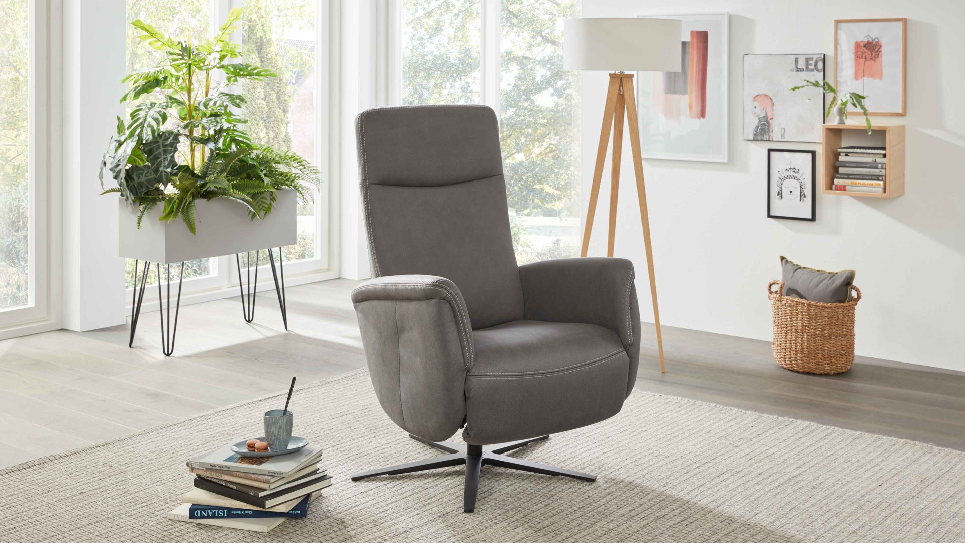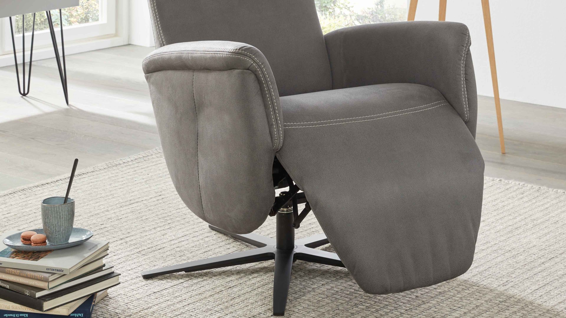 Der attraktive Relaxsessel 1DRF aus dem Modulmaster-Programm MM-ZE1062 ist stilvoll designt und überaus komfortabel. Durch den markanten anthrazitfarbenen Stoffbezug mit beigefarbener Doppelsteppnaht und den mattschwarzen Aluminium-Sternfuß strahlt er moderne Eleganz aus.
