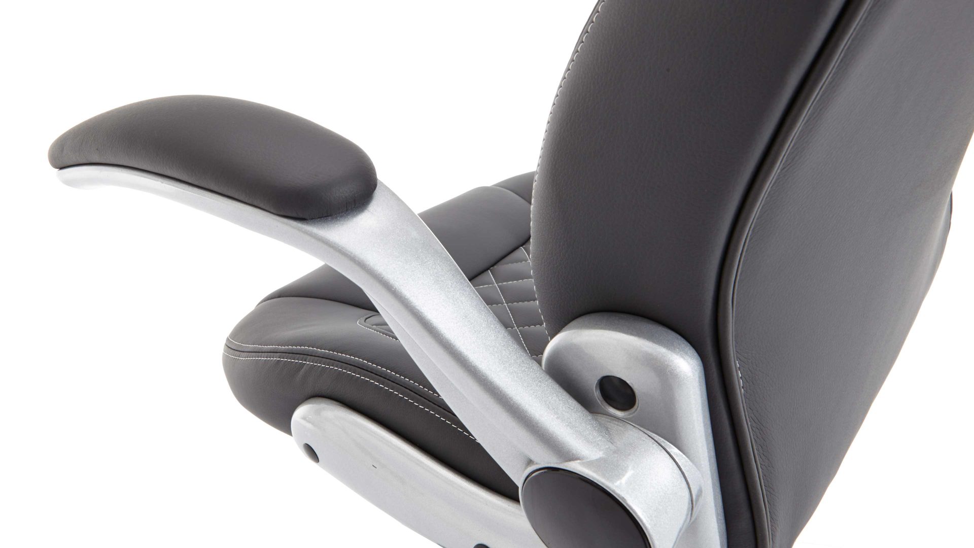 Der Drehstuhl begeistert mit einem anthrazitfarbenen Kunstlederbezug und einem silberfarbenen Nylon-Drehkreuz. Stellen Sie das bequeme Büromöbel an Ihren Schreibtisch, wo es mit den Maßen von ca. 68 x 116 – 126 x 68 cm (BxHxT) perfekt hinpasst. Durch die klappbaren sowie gepolsterten Armlehnen ist entspanntes Arbeiten garantiert.