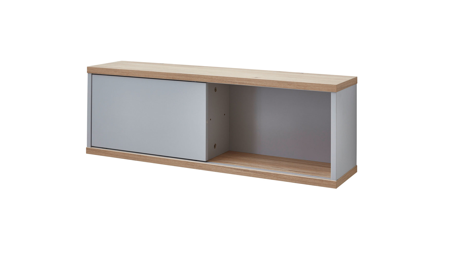Funktional überzeugt das erstklassig verarbeitete Regal mit einem großen Fach rechts sowie einem durch einen Einlegeboden unterteilten Bereich linksseitig. Die praktische Schiebetür lässt sich komplett von links nach rechts durchschieben. Es steht demnach offener und halbgeschlossener Stauraum für verschiedene Gegenstände zur Verfügung, etwa Spielsachen, Bücher und Zeitschriften, Fotoalben, CDs, DVDs und Blu-Rays oder andere Utensilien, die entweder vor Licht und Staub geschützt oder dekorativ sichtbar aufbewahrt werden sollen. Auf ca. 86 x 29 x 20 cm (BxHxL) belaufen sich die Maße des praktischen Regalelements.
