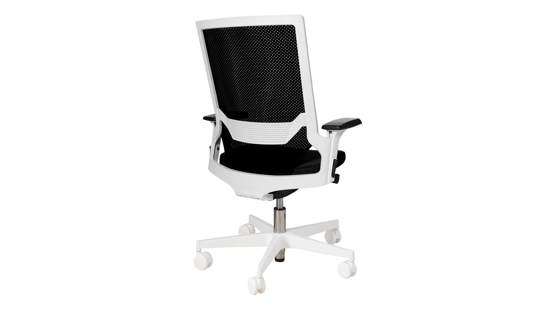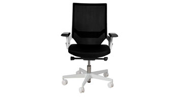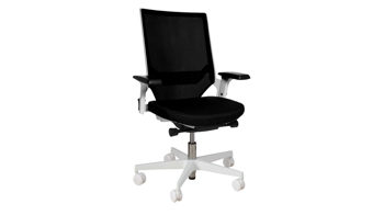 Der stilvolle Topstar Drehstuhl Autosyncron-1  kombiniert klassisch schwarzen Stoff- und Meshbezug mit einem weißen Kunststoff-Drehkreuz. Ebenfalls weiße Metall-Armlehnen mit einer wiederum schwarzen Polsterauflage runden das schwarz-weiße Design dieses modernen Bürostuhls harmonisch ab.