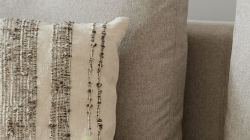 Kissenbezug mit eingenähten schwarzen Wollfäden, unifarbener Rückseite und verdecktem Reißverschluss