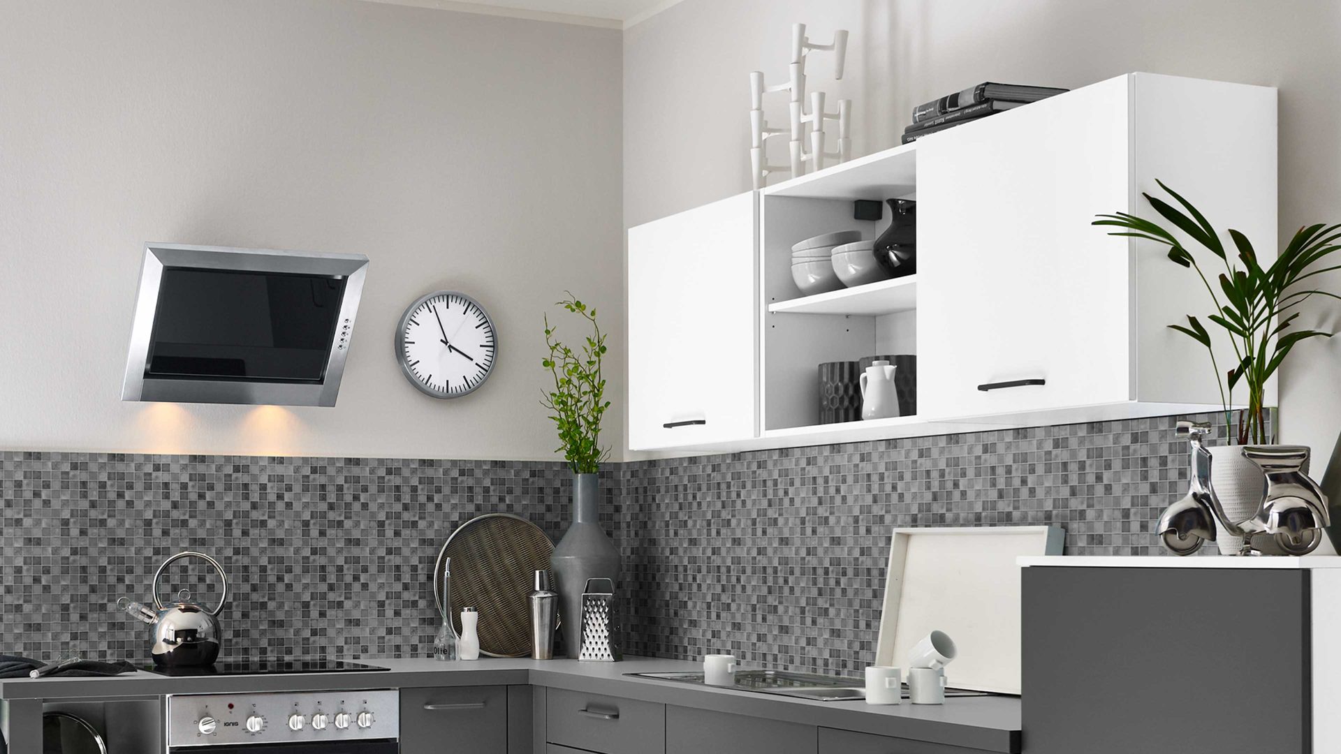 • Die Abbildung zeigt ein Wohnbeispiel, welches auch Dekoration sowie separat erhältliches Zubehör enthält. Im Lieferumfang enthalten sind eine Kücheninsel und eine Hochschranklösung.