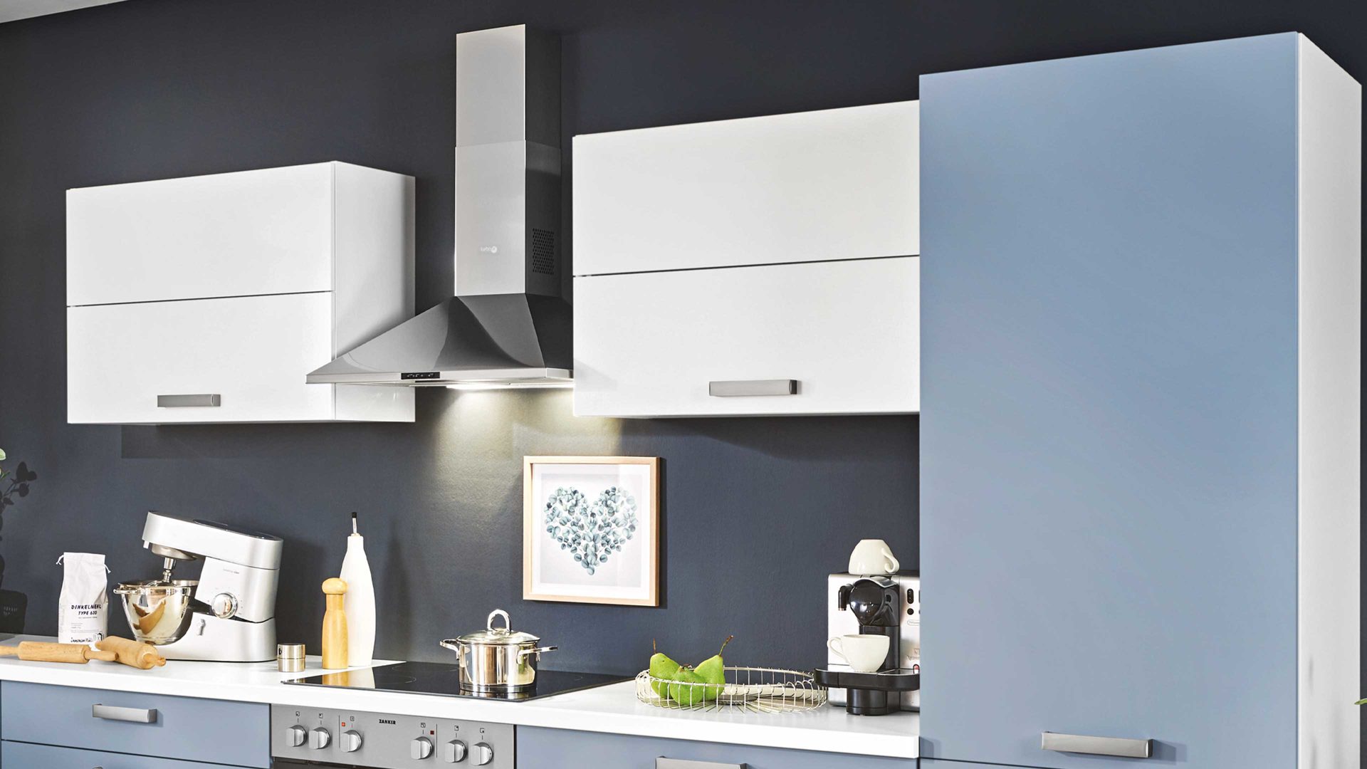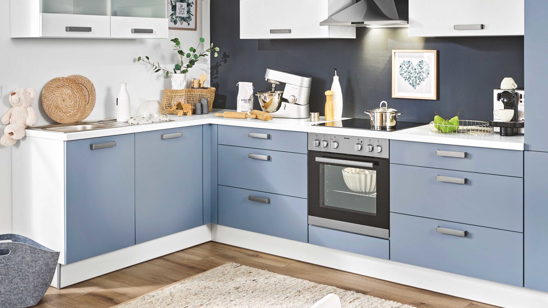 Die Fronten dieser pino Einbauküche sind hauptsächlich in edlem Pastellblau designt, kombiniert mit puristischem Weiß. Auch die Korpusseiten, Sockelblenden und Arbeitsplatten präsentieren sich in Weiß. Einen gelungenen Akzent setzen die Milchglas-Einsätze bei den Hängeschränken. Edelstahlfarbene Metall-Bügelgriffe runden die modern-elegante Optik stilvoll ab.