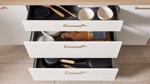 Die Culineo® Einbauküche C187 vereint warmes, wohnliches Design mit funktionaler Ausstattung und hochwertigen Materialien. Magnolienfarbener Mattlack, kombiniert mit Eiche Como Nachbildung und goldfarbenen Bügelgriffen, sorgt für eine harmonische, elegante Optik. Matte magnolienfarbene Korpusse, Regalböden und Sockelblenden unterstreichen den modernen Charakter, während grifflosen Fronten in Eiche Como Nachbildung das klare Design abrunden.