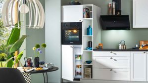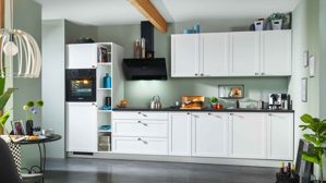 mit Hochschrank für Backofen und Kühlschrank und hohem Regalelement