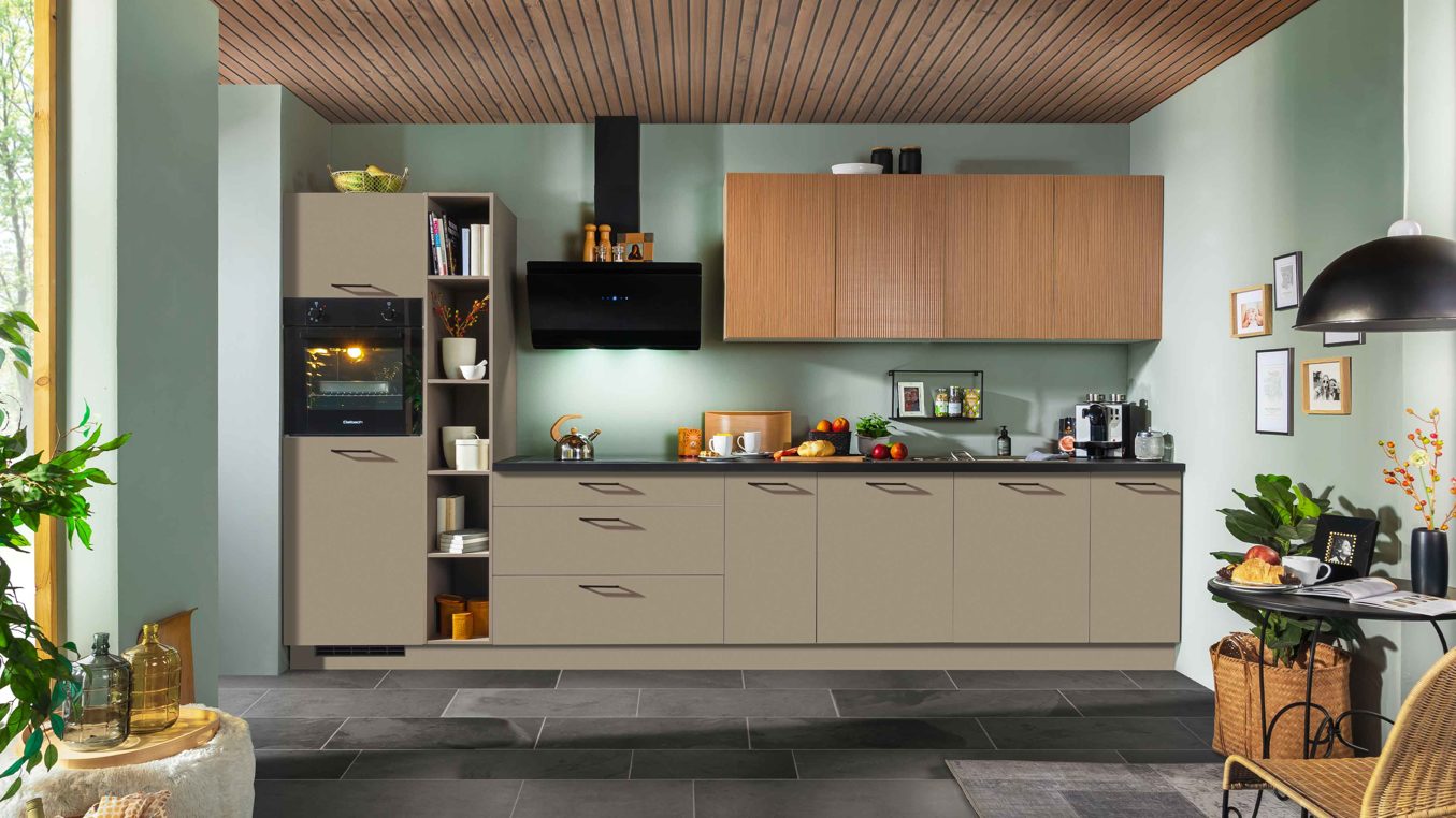 mattes Cremegrau, kombiniert mit hellbraunem Streifendekor und einer Arbeitsplatte in schwarzer Steintruktur-Nachbildung