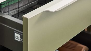 Die Interliving Küche Serie 3074 zeigt, dass auch ein Hauswirtschaftsraum mehr sein kann als nur Stauraum. Mit ihren softmatten olivgrünen Fronten strahlt sie Wärme und Natürlichkeit aus, während die authentische Vulkaneiche-Nachbildung an Sockelblenden, Regalen und Nischenverkleidung für wohnlichen Charakter sorgt. Dezente Metallgriffe runden das harmonische Gesamtbild im beliebten Natural-Living-Stil stilvoll ab.