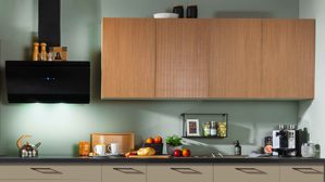 hochgebauter Backofen, vollintegrierter Kühlschrank und eine kopffreie Dunsthaube