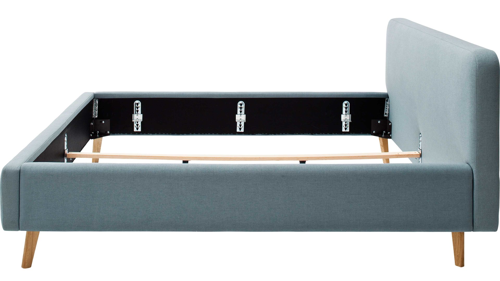 Mit den eichefarbenen Holzfüßen und dem eisblauen Flachgewebebezug bringt das Polsterbettgestell Mattis maritimes Flair in Ihr Schlafzimmer.