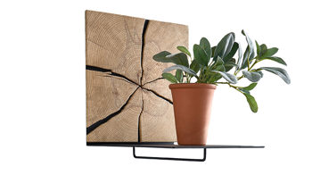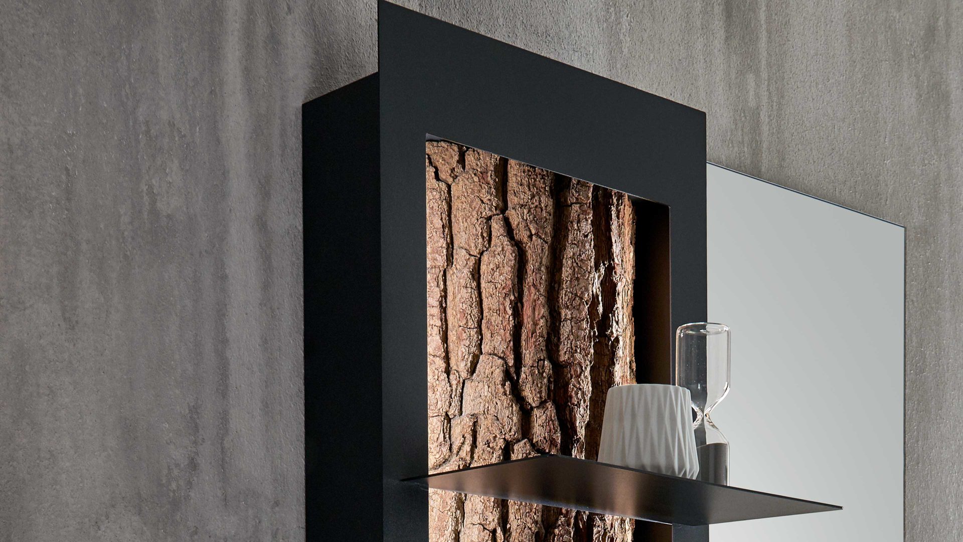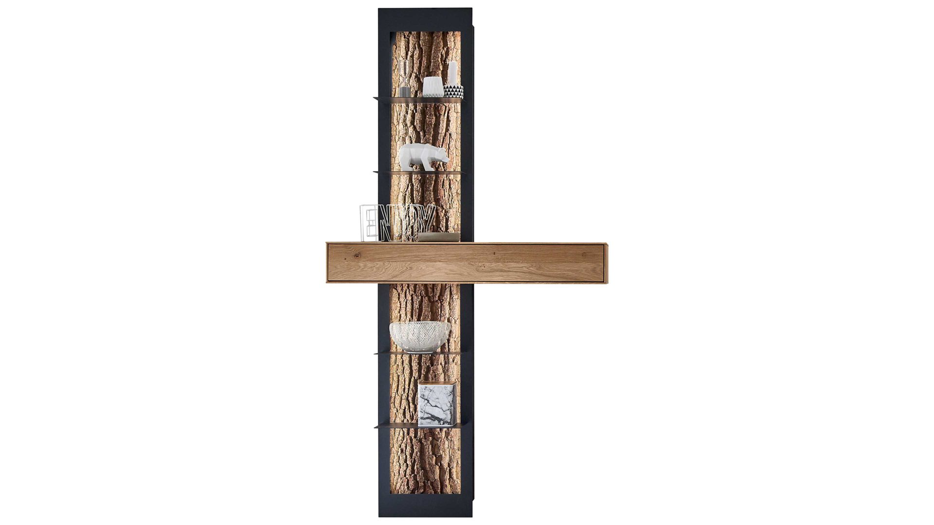 Das Regalelement Runa verbindet massive Kerneiche, Rindenholz und anthrazitfarben pulverbeschichtetes Metall zu einem robusten, modernen und eindrucksvollen Ganzen.