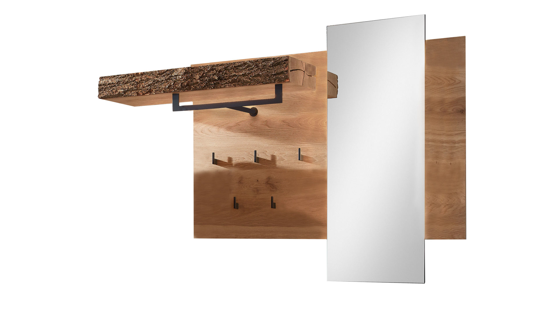 Bei der stark gebürsteten Kerneiche handelt es sich um erstklassiges Massivholz, das mit den Kernrissen und Flügelästen authentische Natürlichkeit in den Flur bringt. Durch die Oberflächenbehandlung mit zwei Schichten sehr matten UV-Wasserlacks und einem finalen Überzug aus Wachs ist das Holz extrem widerstandsfähig und langlebig. Die akzentuierende Rindenholz-Rückwand mit Metallrahmen sowie die vier metallenen Regalböden wirken kontrastierend, fügen sich aber dennoch harmonisch ins Gesamtbild ein.