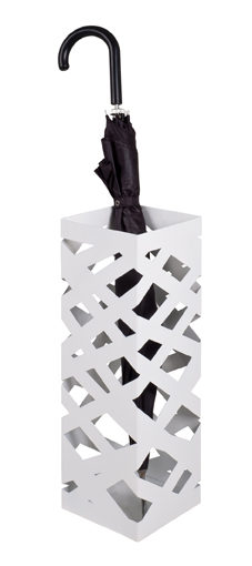 Der schwarze Schirmständer GRAPHIT mit umlaufendem Lochmuster ist aus Metall, die Oberfläche ist matt beschichtet. Die Unterseite ist gummiert. Der Schirmständer hat einen Durchmesser von 21 cm und ist 50 cm hoch.