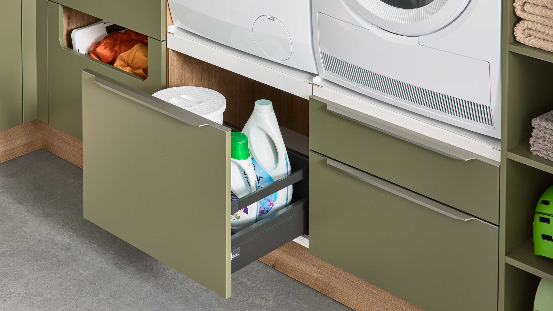 Interliving Küche Serie 3074 – stilvolle Hauswirtschaftsraumlösung in Olivgrün und Vulkaneiche für Ordnung und Wohnlichkeit