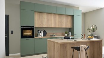 mattes Eukalyptusgrün, kombiniert mit schwarzen Griffen und Alteiche Provence-Nachbildung